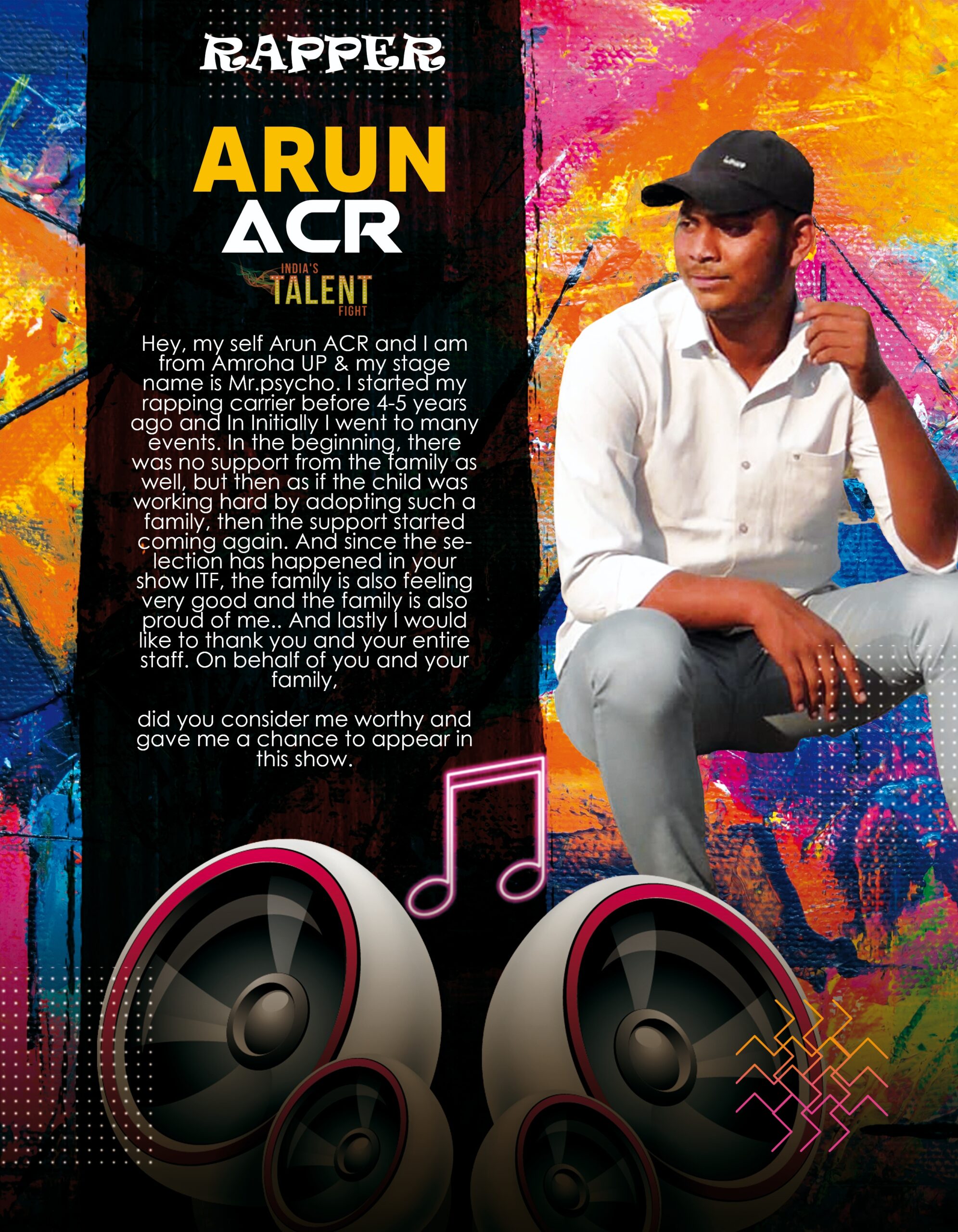 N A.C.R. AMROHA RAPPERHey, my self Arun ACR and I am from Amroha UP & my stage name is Mr.psycho. I started my rapping carrier before 4-5 years ago and In Initially I went to many events. In the beginning, there was no support from the family as well, but then as if the child was working hard by adopting such a family, then the support started coming again. And since the selection has happened