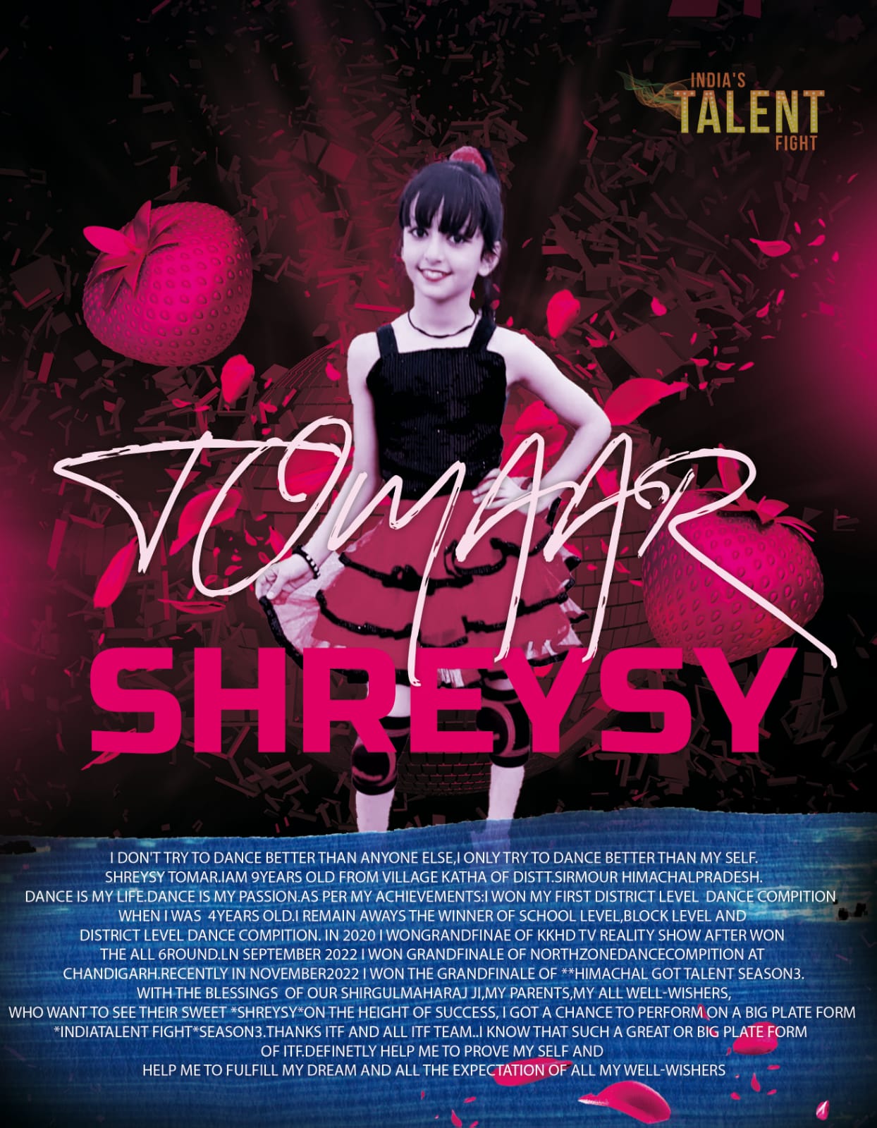 SHREYSY TOMAR HIMACHAL PRADESH DANCERI don’t try to dance better than anyone else,I only try to dance better than my self.Shreysy Tomar.iam 9years old from village Katha of distt.Sirmour HimachalPradesh.Dance is my life.Dance is my Passion.As per my achievements:I won my first district level dance compition when I was 4years old.I remain aways the winner of school level,block level and district level dance compition. In 2020 I wonGrandFinale of KKHD tv reality show after won