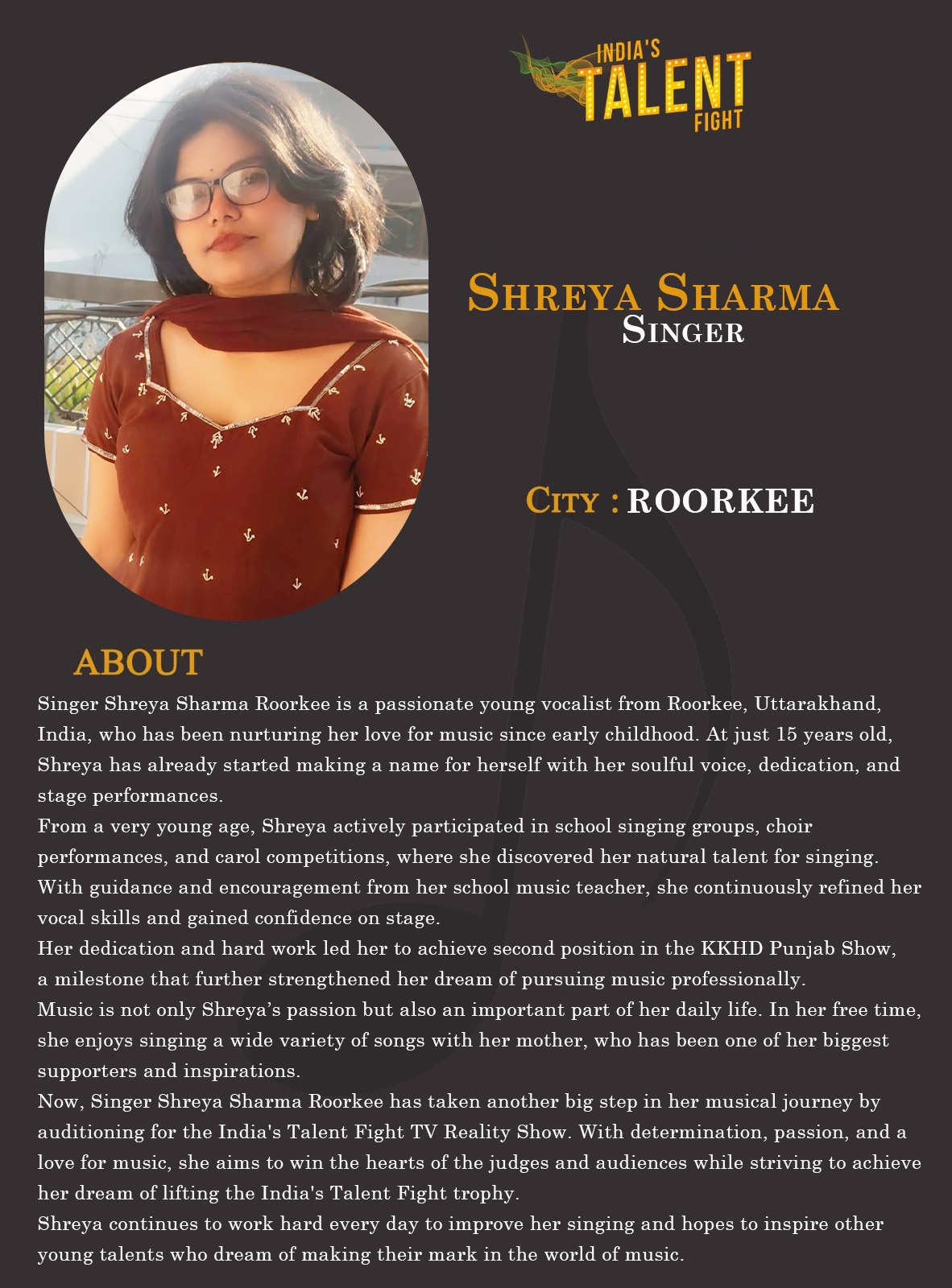 ITF Singer Shreya Sharma RoorkeeI am Roosum (Nisha) Barnwal, an Indian singer and dancer from Kaptanganj Town, located in Kushinagar district of Uttar Pradesh, India.I identified from very early stage that I have interest in singing as I used to participate in my school functions so from there I got some confidence and I dreamed to become a singer.And through practice and my dedication towards singing and by God Grace I started performing in different