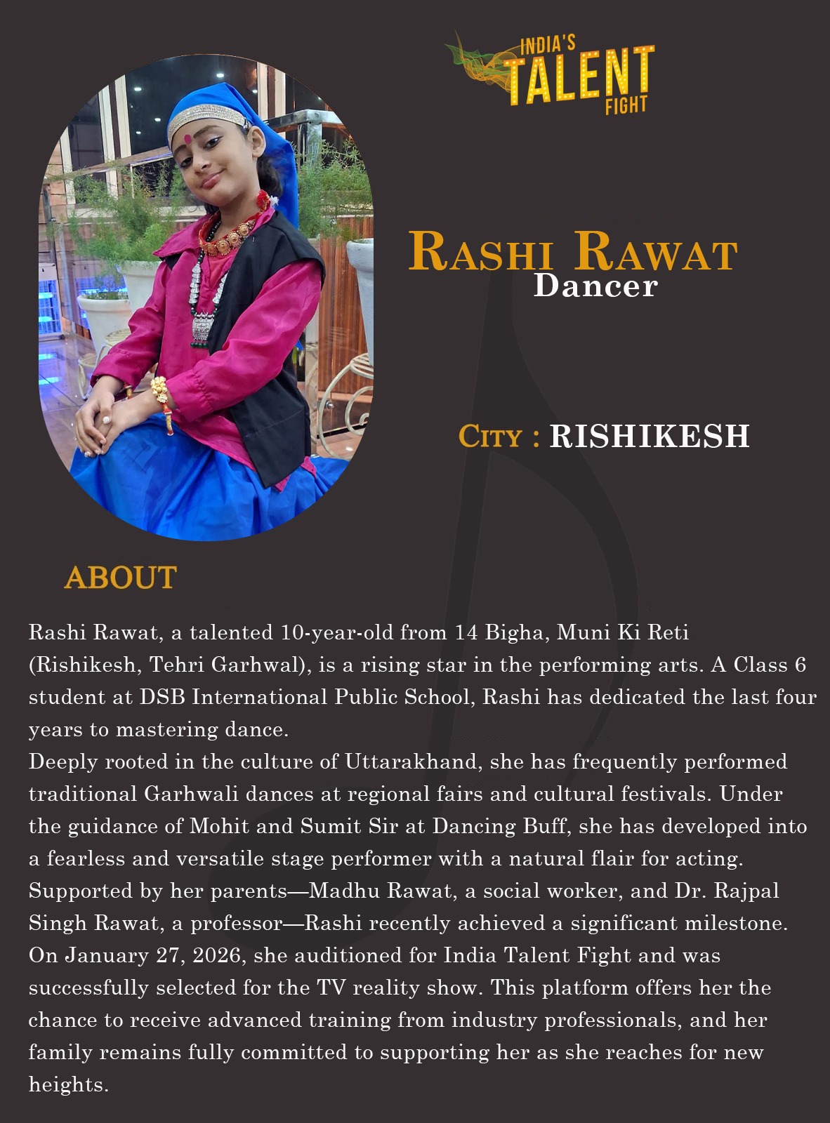 ITF Dancer Rashi Rawat RishikeshRashi Rawat, a talented 10-year-old from 14 Bigha, Muni Ki Reti (Rishikesh, Tehri Garhwal), is a rising star in the performing arts. A Class 6 student at DSB International Public School, Rashi has dedicated the last four years to mastering dance.Deeply rooted in the culture of Uttarakhand, she has frequently performed traditional Garhwali dances at regional fairs and cultural festivals. Under the guidance of Mohit and Sumit Sir at Dancing Buff,