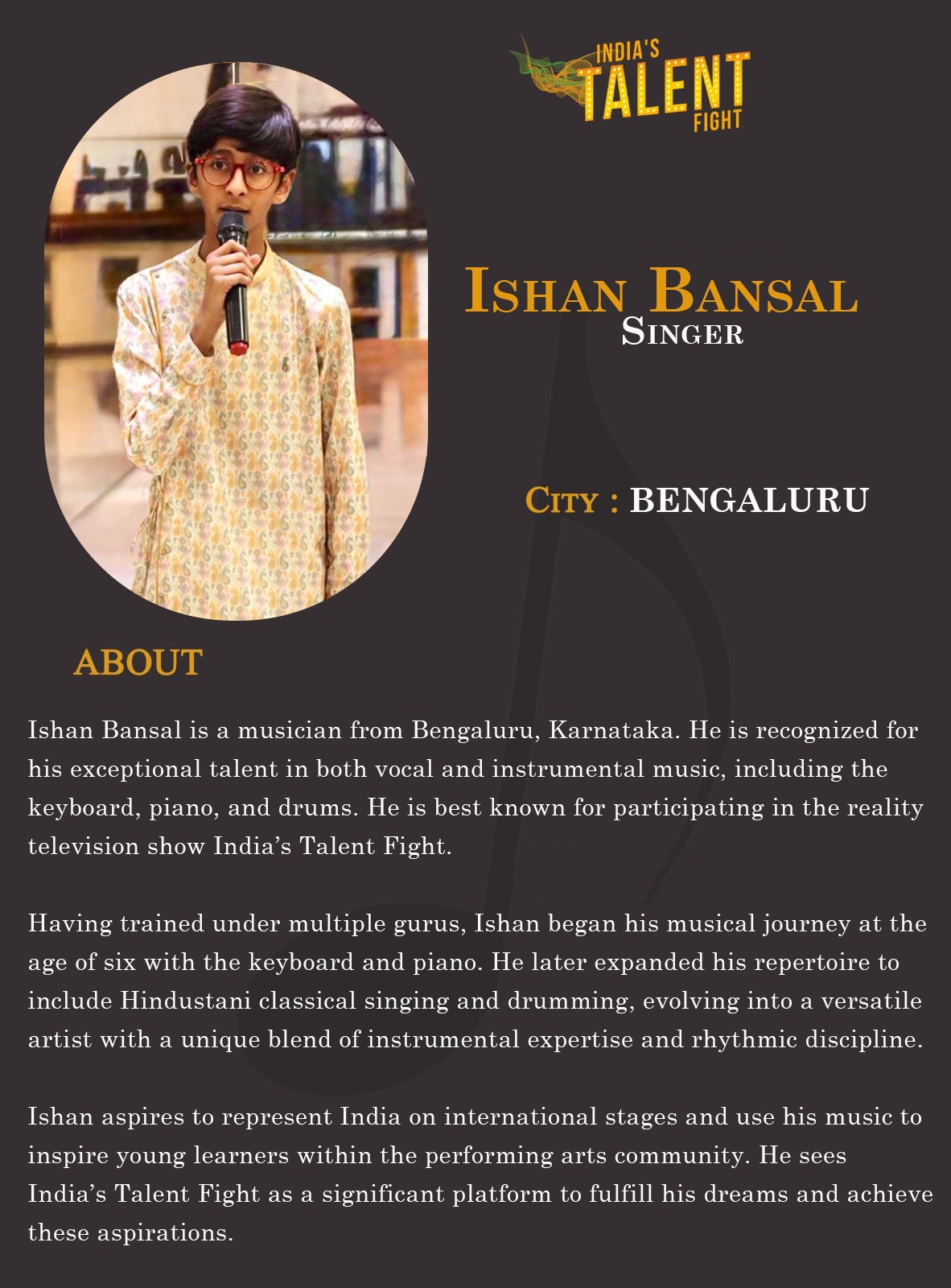 ITF Singer Ishan Bansal BengaluruIshan Bansal is a musician from Bengaluru, Karnataka. He is recognized for his exceptional talent in both vocal and instrumental music, including the keyboard, piano, and drums. He is best known for participating in the reality television show India’s Talent Fight.Having trained under multiple gurus, Ishan began his musical journey at the age of six with the keyboard and piano. He later expanded his repertoire to include Hindustani classical singing and