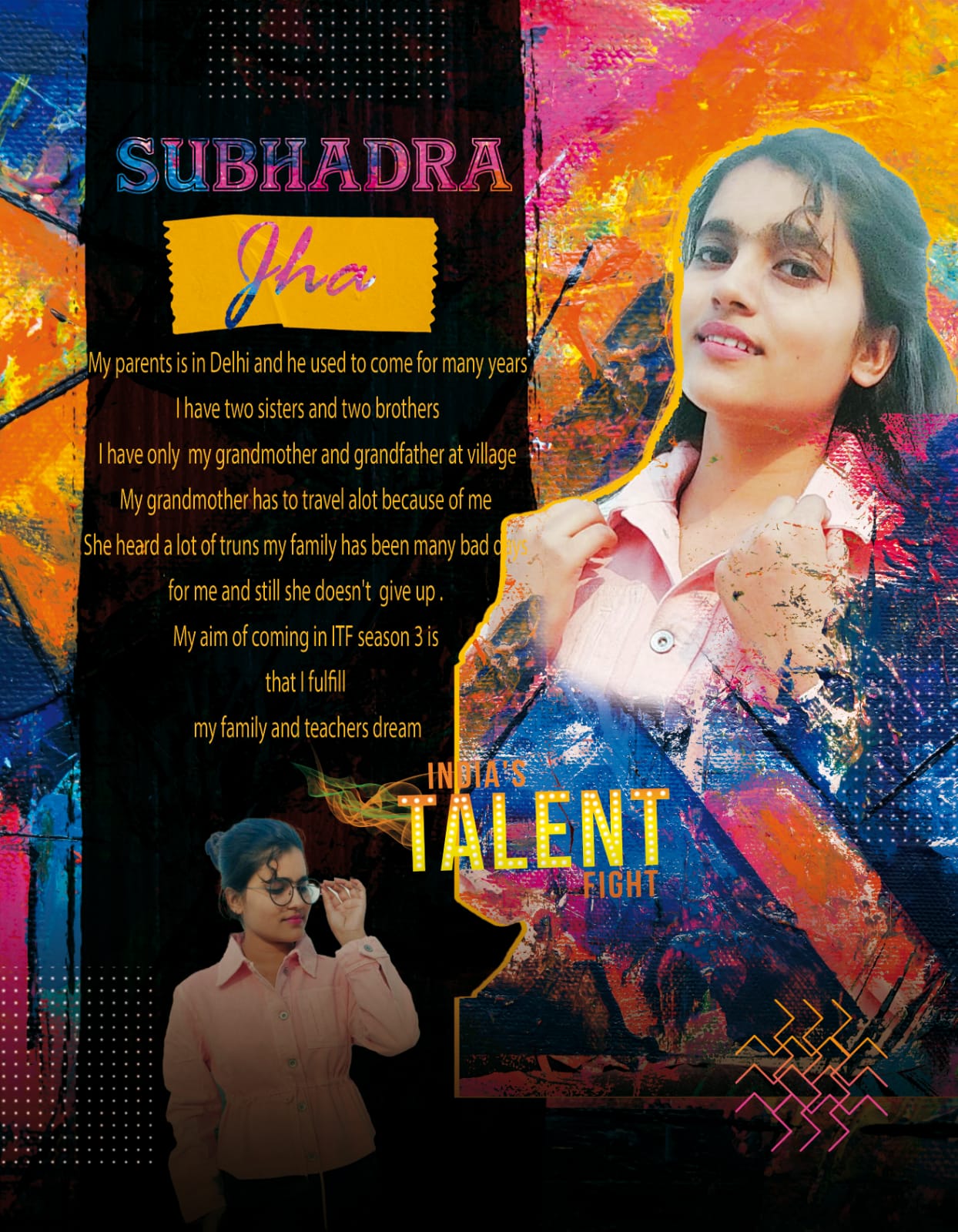 SUBHADRA KUMARI MADHUBANI SINGERHello everyoneMy name is subhadra jha.From Bihar benipatti madhubaniMy parents is in Delhi and he used to come for many years I have two sisters and two brothersI have only my grandmother and grandfather at villageMy grandmother has to travel alot because of meShe heard a lot of truns my family has been many bad days for me and still she doesn’t give up theHow will I give upLearning singing for last