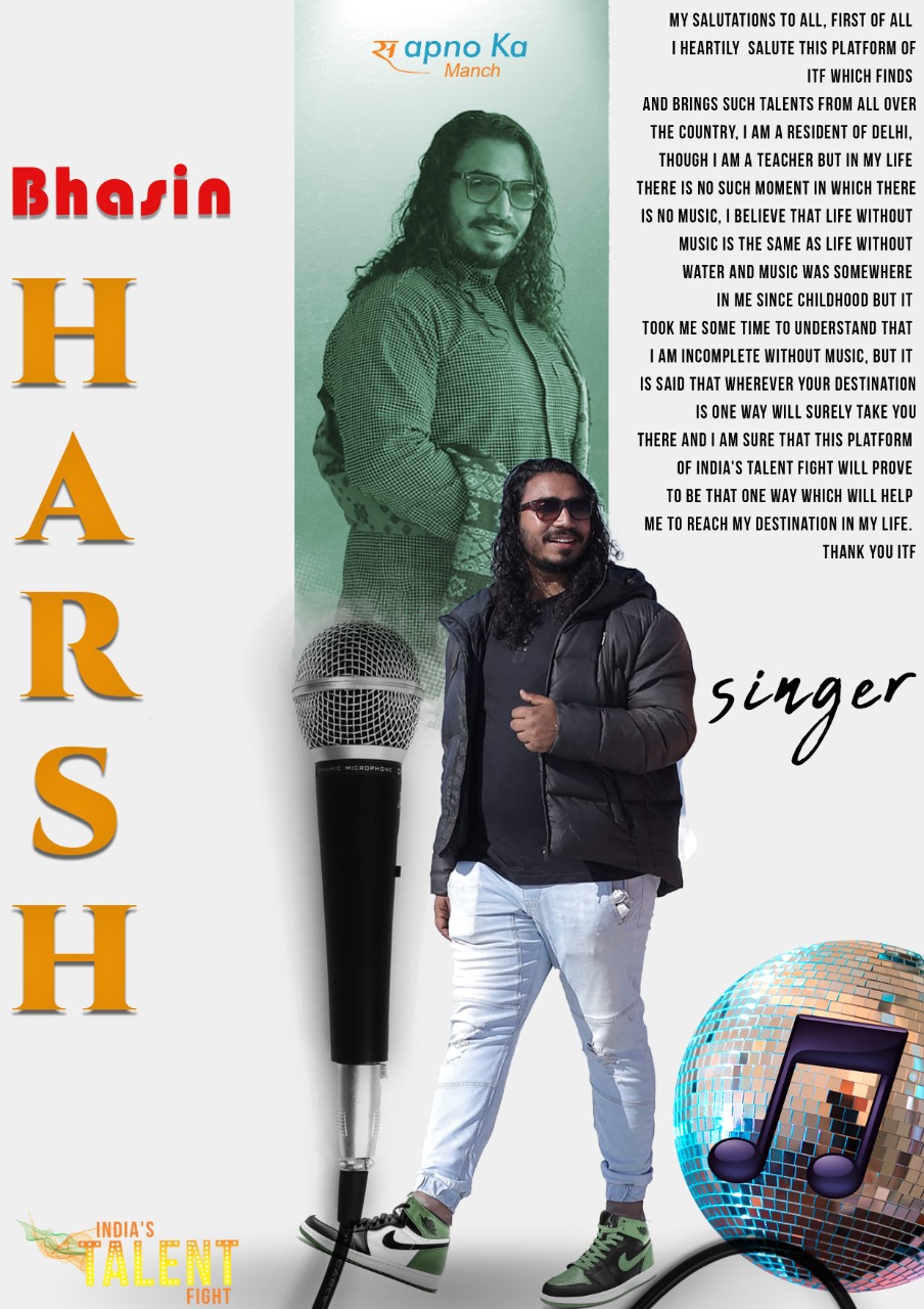 HARSH BHASIN NOIDA SINGERMy salutations to all, first of all I heartily salute this platform of ITF which finds and brings such talents from all over the country, I am a resident of Delhi, though I am a teacher but in my life there is no such moment in which there is no music, I believe that life without music is the same as life without water and music was somewhere in me since childhood