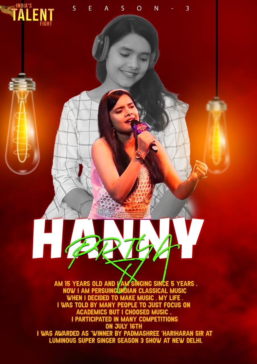 HANNY PRIYA HAJIPUR SINGERHello !My name is Hanny PriyaI am 15 years old and I am singing since 5 years .Now I am persuing Indian classical musicWhen I decided to make Music , my life ,I was told by many people to just focus on academics but I choosed Music .I participated in many competitions and learnt a lot from their.On July 16thI was awarded as *Winner by Padmashree *Hariharan sir at Luminous Super Singer