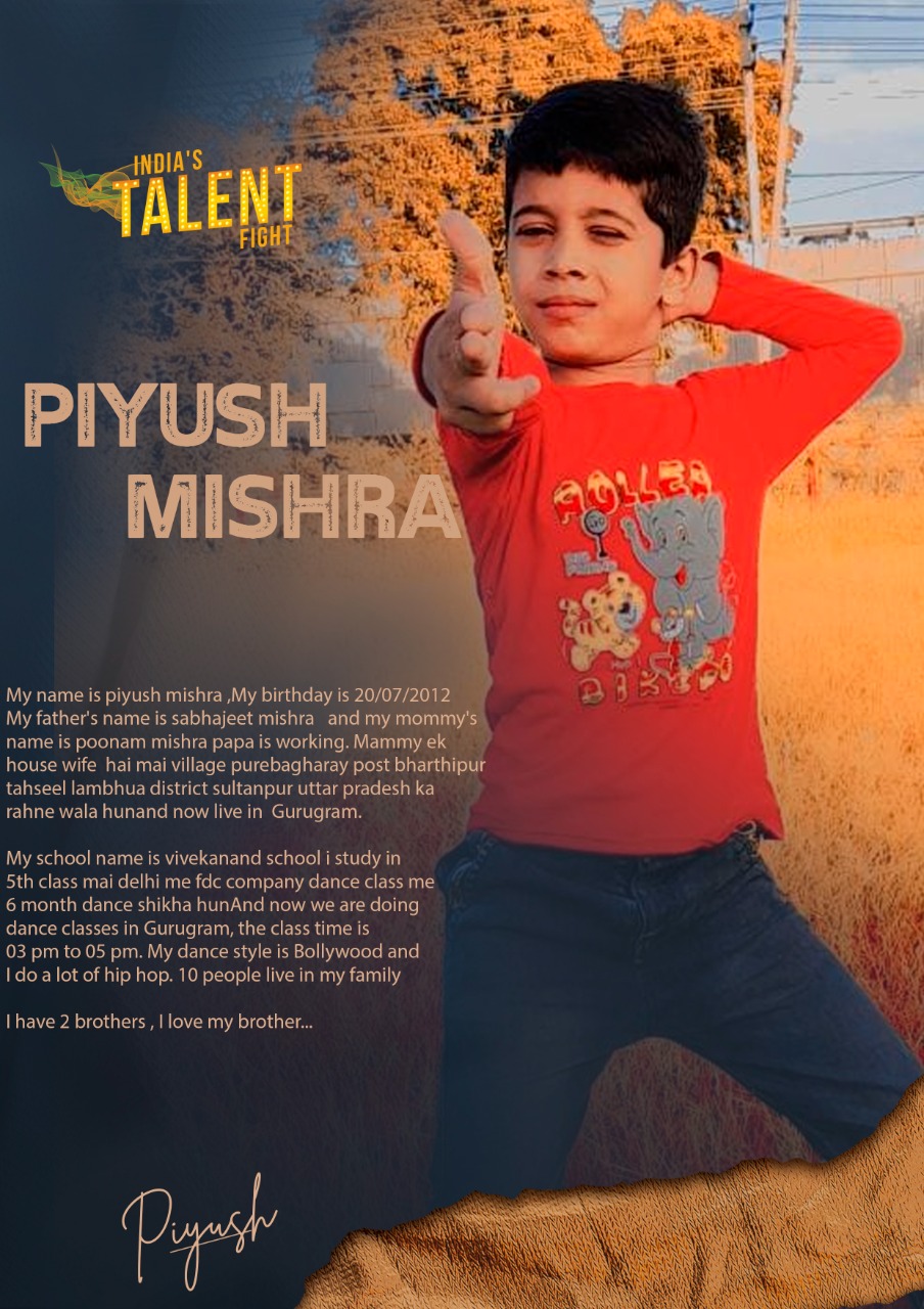 PIYUSH MISHRA GURGAON DANCERmy name is piyush mishramy birthday is 20/07/2012my father’s name is sabhajeet mishraand my mommy’s name is poonam mishrapapa is workingmammy ek house wife hai mai village purebagharay post bharthipur tahseel lambhua district sultanpur uttar pradesh ka rahne wala hunand now live in Gurugrammy school name is vivekanand school i study in 5th classmai delhi me fdc company dance class me 6 month dance shikha hunAnd now we are doing dance classes
