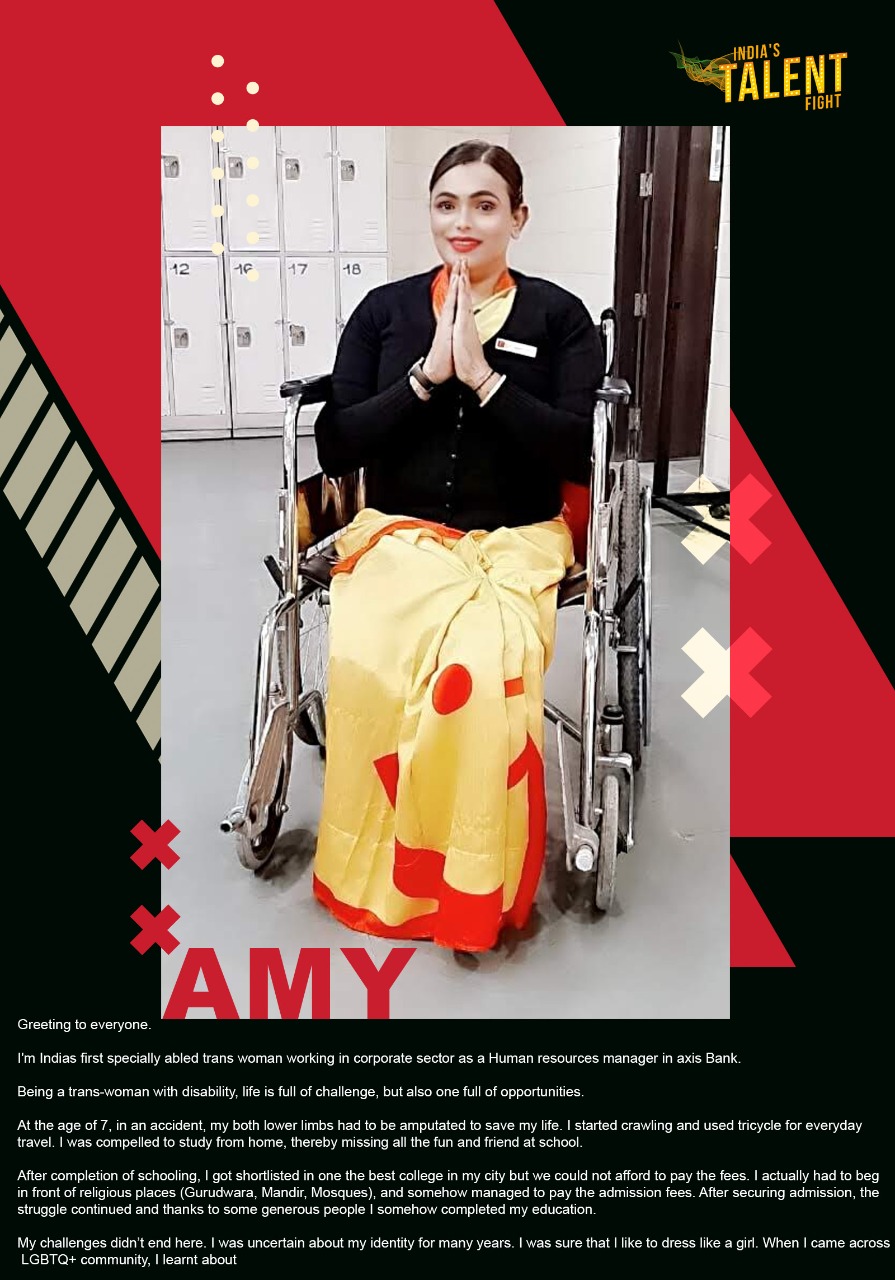 AMY CHAUHAN NEW DELHI DANCERHello! everyone.I’m Indias first specially abled trans woman working in corporate sector as a Human resources manager in axis Bank.Being a trans-woman with disability, life is full of challenge, but also one full of opportunities.At the age of 7, in an accident, my both lower limbs had to be amputated to save my life. I started crawling and used tricycle for everyday travel. I was compelled to study from home, thereby
