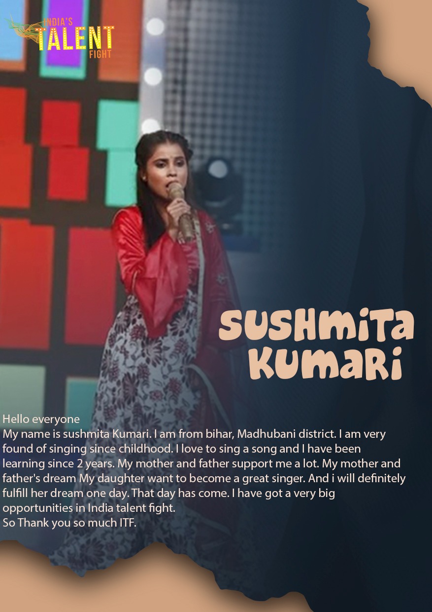 Shushmita Kumari Bihar SingerMy name is Sushmita Kumari. I am from Bihar, Madhubani district. I am very fond of singing since childhood. I love to sing a song and I have been learning since 2 years. My mother and father support me a lot. My mother and father’s dream My daughter want to become a great singer. And i will definitely fulfill her dream one day. That day has come. I have got very big