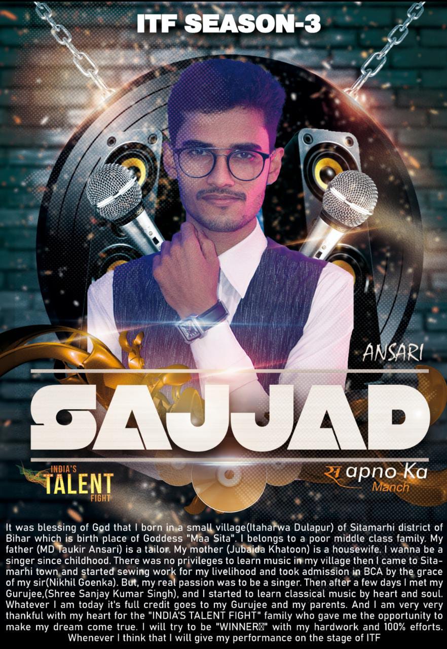 Sajjad Ansari (Prince) Sitamarhi BiharMy name is Sajjad Ansari (Prince). It was blessing of God that I born in a small village(Itaharwa Dulapur) of Sitamarhi district of Bihar which is birth place of Goddess “Maa Sita”. I belongs to a lower middle class family. My father (MD Taukir Ansari) is a tailor. My mother (Jubaida Khatoon) is a housewife.I wanna be a singer since childhood. There was no privileges to learn music in my village