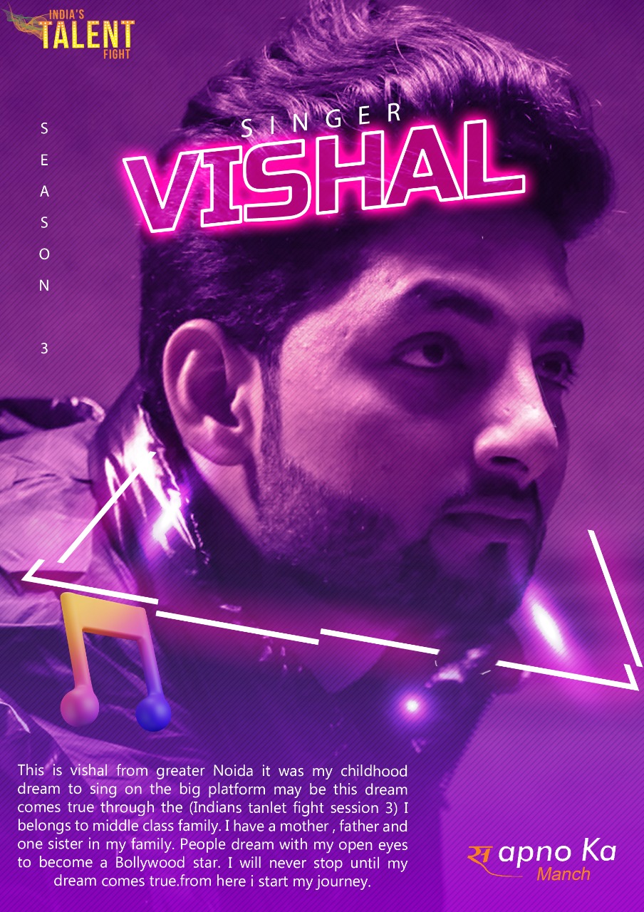 VISHAL CHHOKER NOIDA SINGERSTORY of my life“Nothing is impossible.The word itself say ‘I m possible!”This is vishal from greater Noida it was my childhood dream to sing on the big platform may be this dream comes true through the (Indians tanlet fight session 3) I belongs to middle class family. I have a mother , father and one sister in my family. People dream with my open eyes to become a Bollywood star.i will never