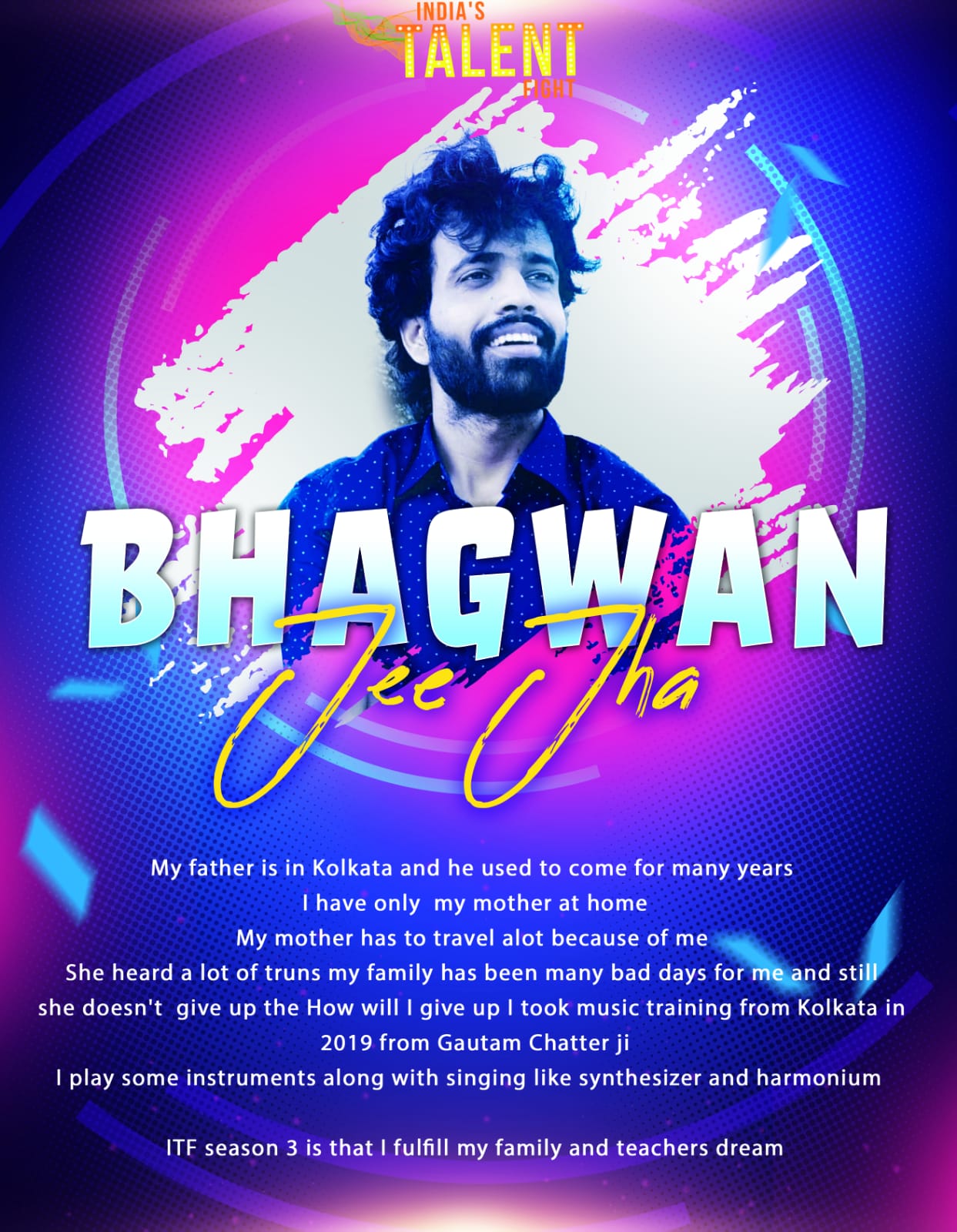 BIPLAB BISWAS BANGLORE SINGERHello everyonemy name:Biplab BishwasI am a singerMy age :18I’m from:Karnatak Raichur district sindhanurI am BengaliAnd l like dance alsoI am studentmy 12 is overI want to fulfill my dream and fulfill my mom dad’s dreamI am coming in India’s talent fight showThank you so much ❤️India’s talent fight show which gave me a chance to sing in such a big showI learned music at homeMy dad is a laborer and my mother
