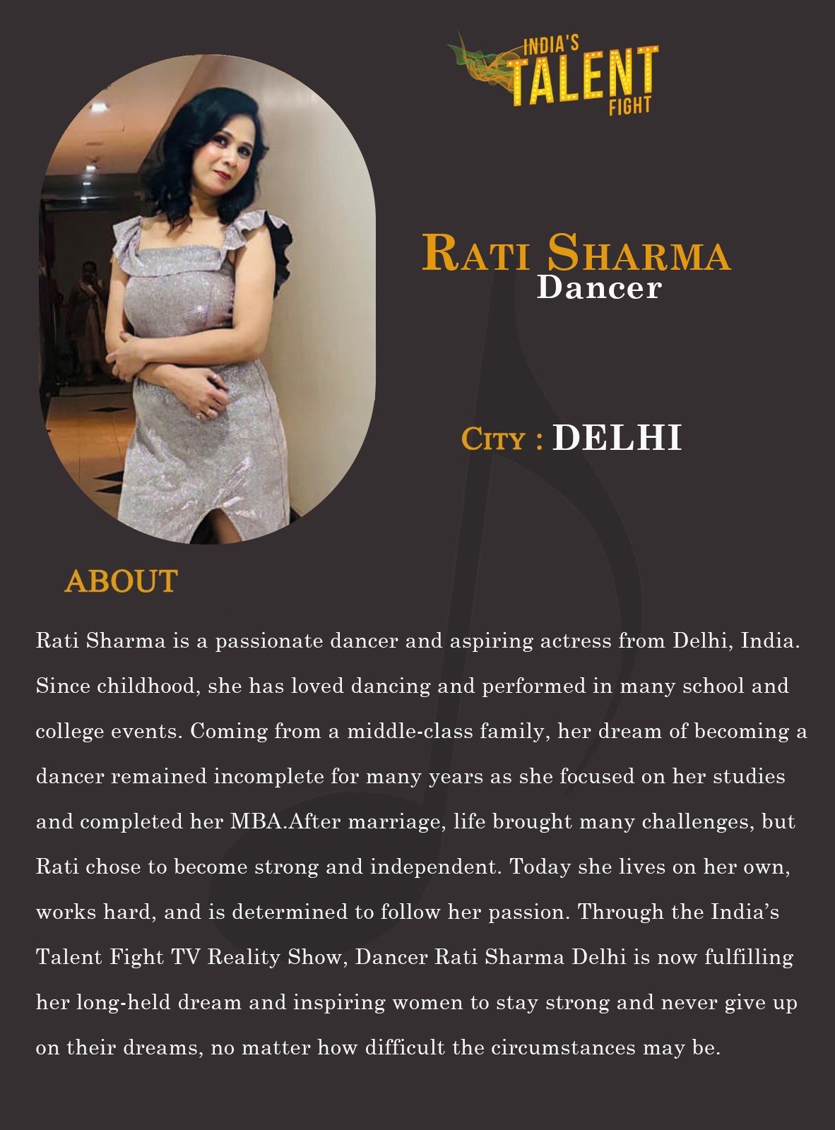 ITF Dancer Rati sharma DelhiRati Sharma is a passionate dancer and aspiring actress from Delhi, India. Since childhood, she has loved dancing and performed in many school and college events. Coming from a middle-class family, her dream of becoming a dancer remained incomplete for many years as she focused on her studies and completed her MBA.After marriage, life brought many challenges, but Rati chose to become strong and independent. Today she lives on her own,