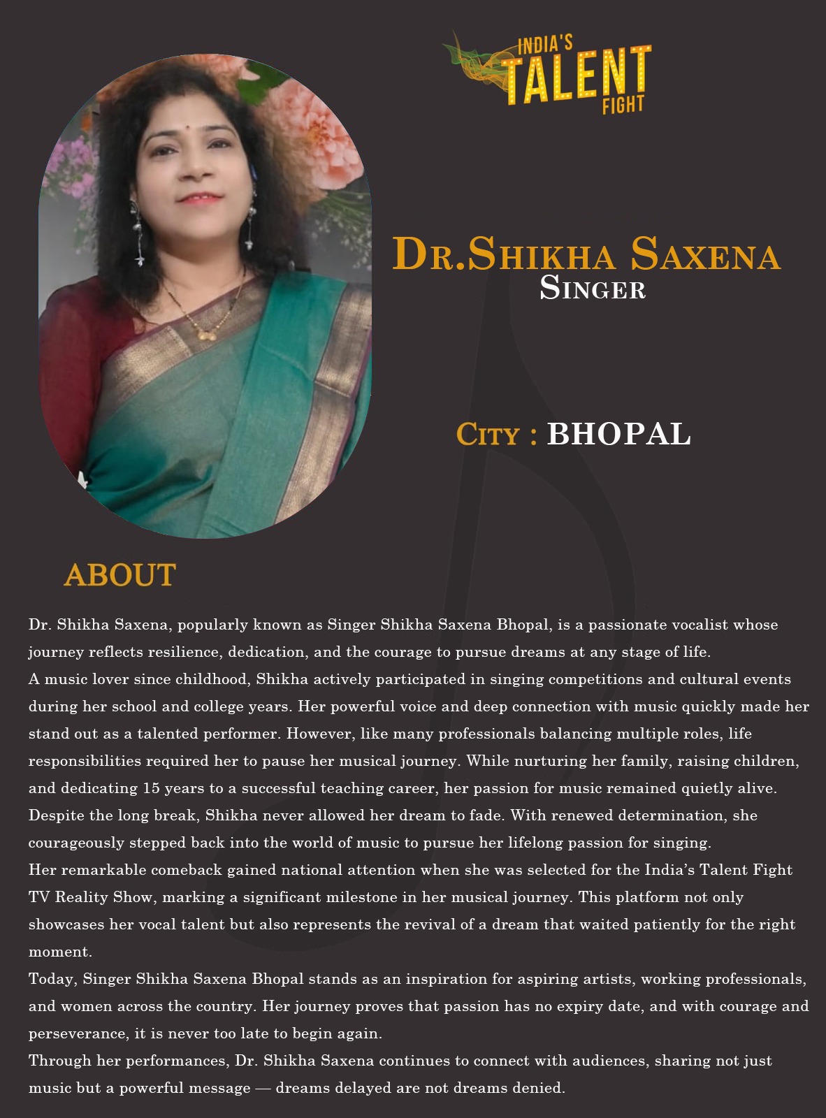 ITF Singer Dr.Shikha Saxena BhopalDr. Shikha Saxena, popularly known as Singer Shikha Saxena Bhopal, is a passionate vocalist whose journey reflects resilience, dedication, and the courage to pursue dreams at any stage of life.A music lover since childhood, Shikha actively participated in singing competitions and cultural events during her school and college years. Her powerful voice and deep connection with music quickly made her stand out as a talented performer. However, like many professionals balancing