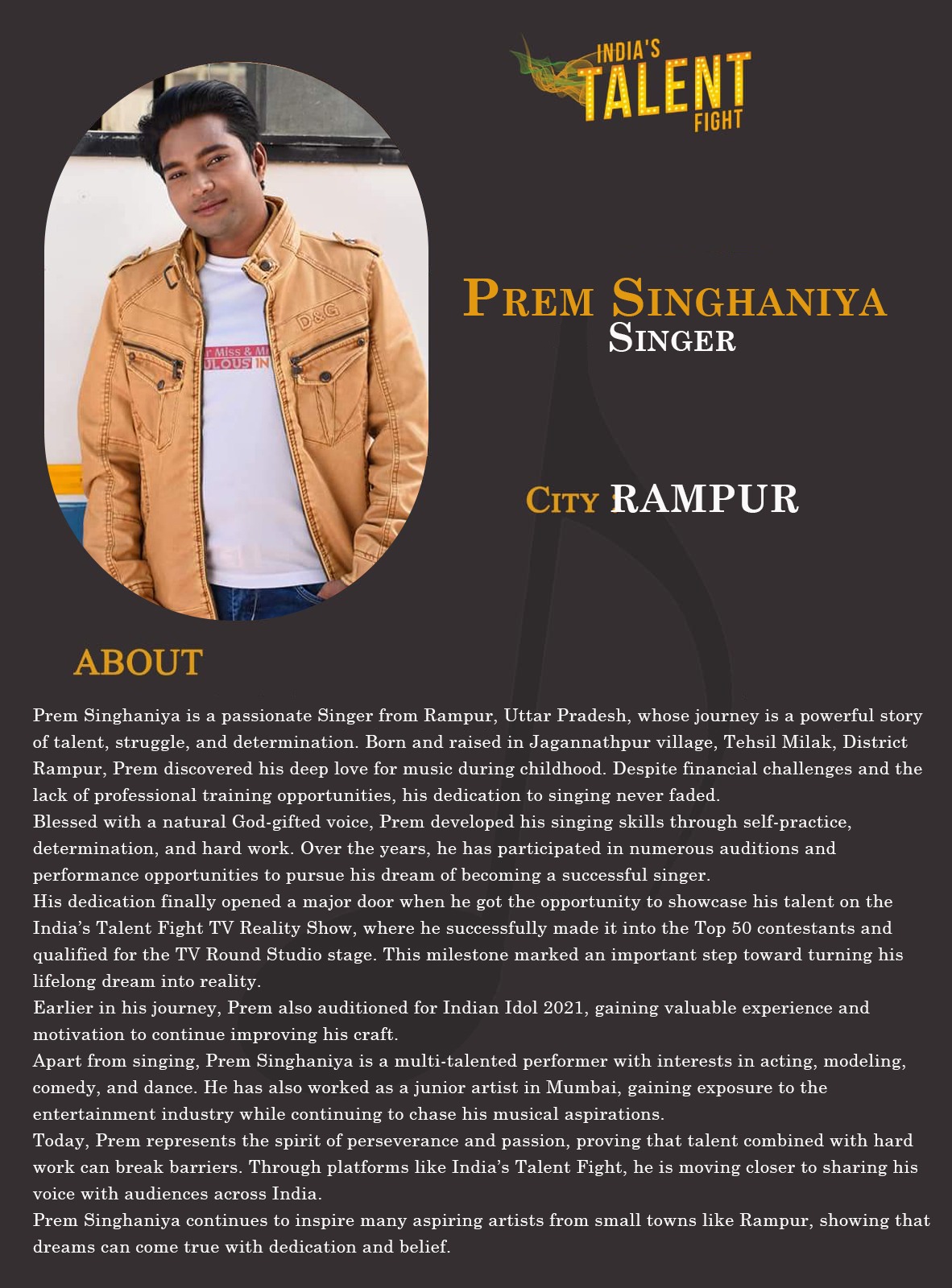 ITF singer Prem Singhaniya RampurPrem Singhaniya is a passionate Singer from Rampur, Uttar Pradesh, whose journey is a powerful story of talent, struggle, and determination. Born and raised in Jagannathpur village, Tehsil Milak, District Rampur, Prem discovered his deep love for music during childhood. Despite financial challenges and the lack of professional training opportunities, his dedication to singing never faded.Blessed with a natural God-gifted voice, Prem developed his singing skills through self-practice, determination, and hard