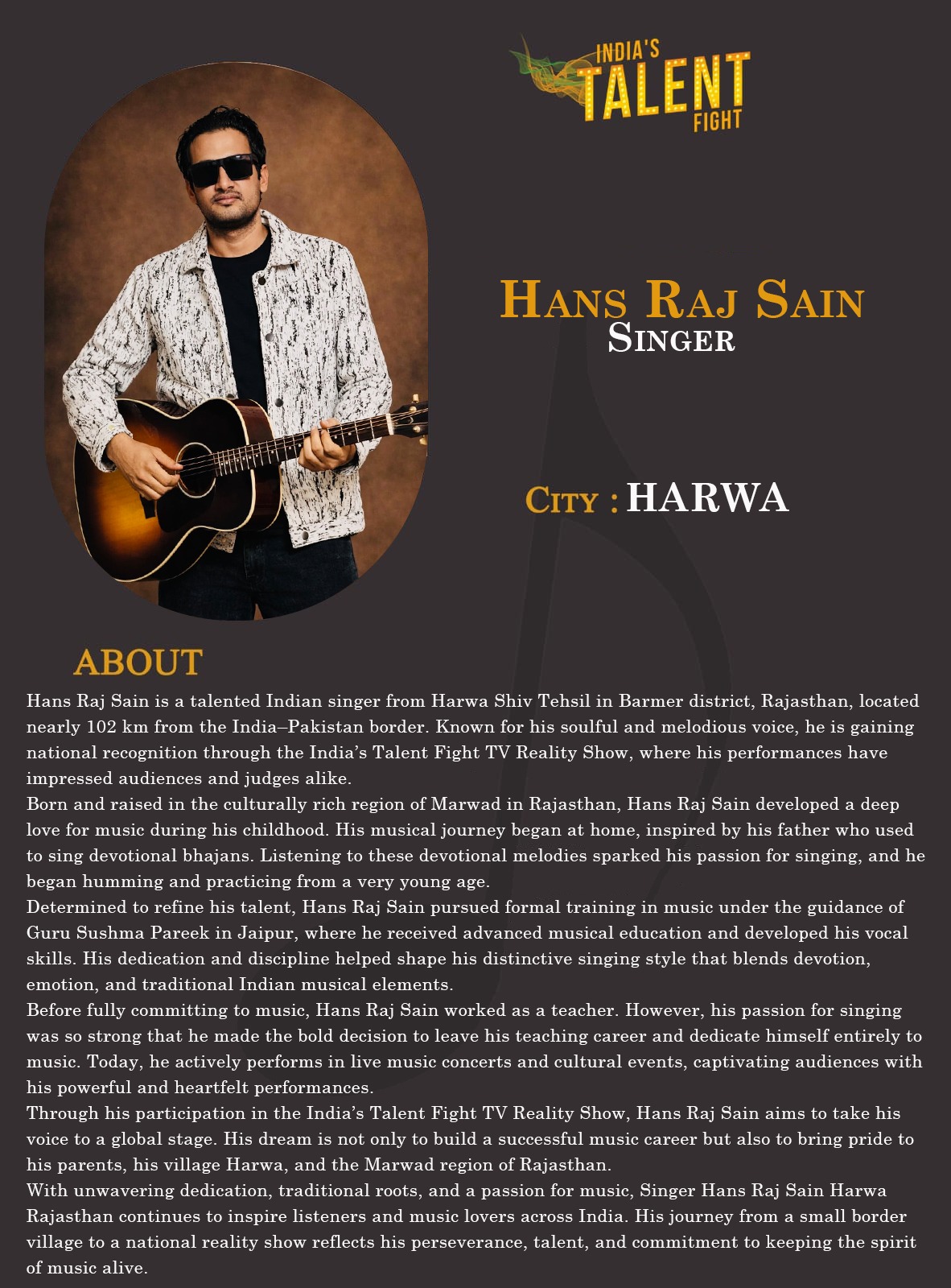 ITF singer Hans Raj Sain HarwaHans Raj Sain is a talented Indian singer from Harwa Shiv Tehsil in Barmer district, Rajasthan, located nearly 102 km from the India–Pakistan border. Known for his soulful and melodious voice, he is gaining national recognition through the India’s Talent Fight TV Reality Show, where his performances have impressed audiences and judges alike.Born and raised in the culturally rich region of Marwad in Rajasthan, Hans Raj Sain developed a deep