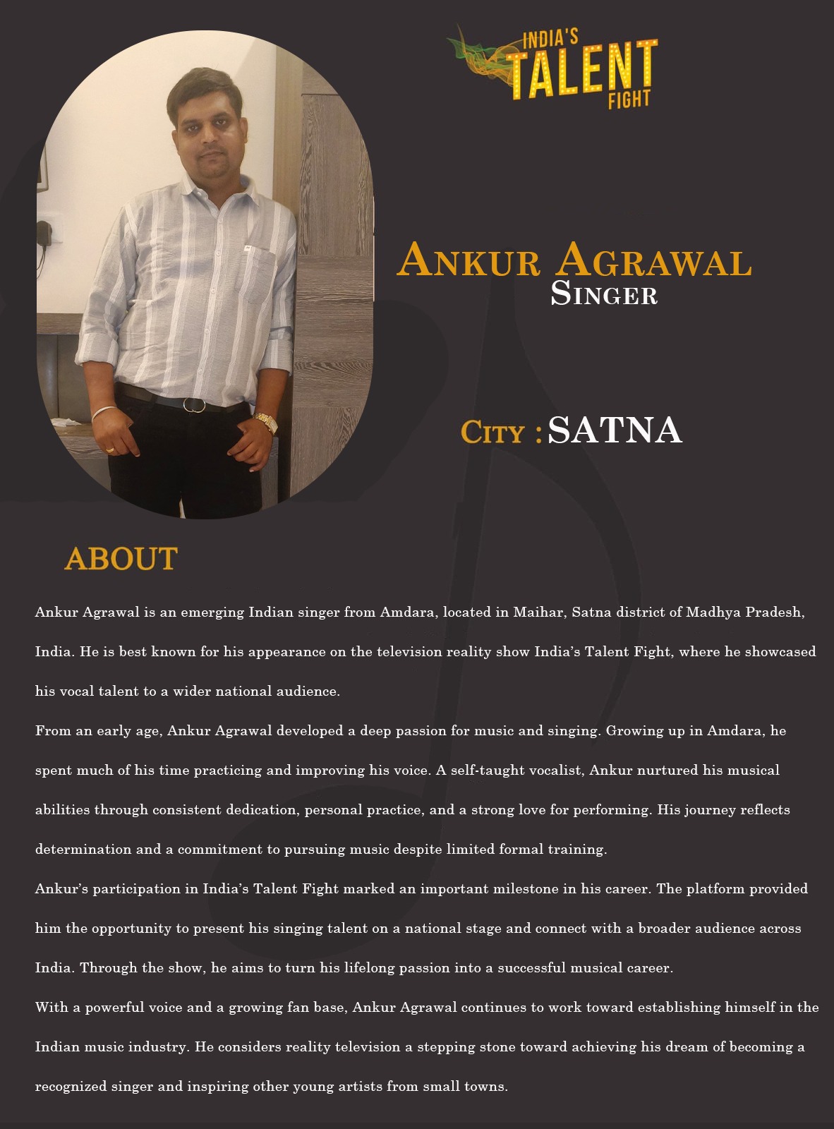 ITF singer Ankur Agrawal satnaAnkur Agrawal is anemerging Indian singer from Amdara, located in Maihar, Satna district of Madhya Pradesh, India. He is best known for his appearance on the television reality show India’s Talent Fight, where he showcased his vocal talent to a wider national audience.From an early age, Ankur Agrawal developed a deep passion for music and singing. Growing up in Amdara, he spent much of his time practicing and improving his voice.