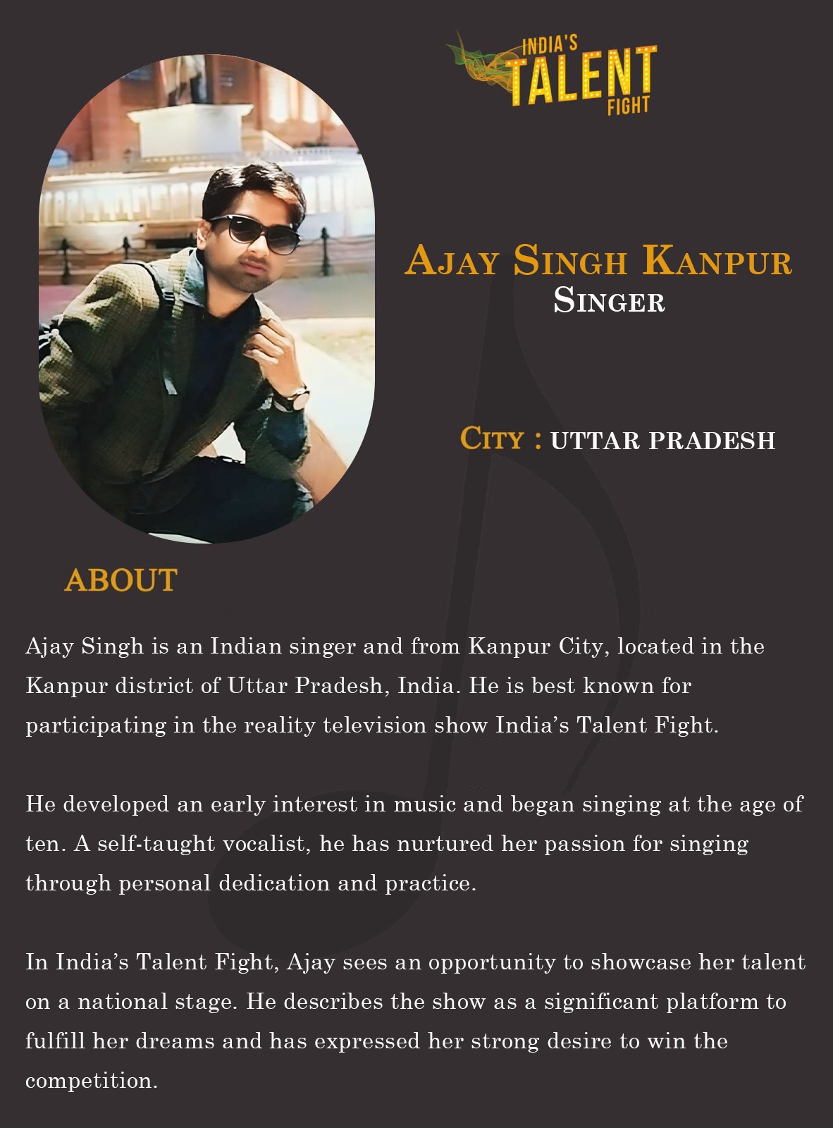 ITF Singer AJAY SINGH Kanpur Uttar PradeshAjay Singh is an Indian singer and from Kanpur City, located in the Kanpur district of Uttar Pradesh, India. He is best known for participating in the reality television show India’s Talent Fight.He developed an early interest in music and began singing at the age of ten. A self-taught vocalist, he has nurtured her passion for singing through personal dedication and practice.In India’s Talent Fight, Ajay sees an opportunity