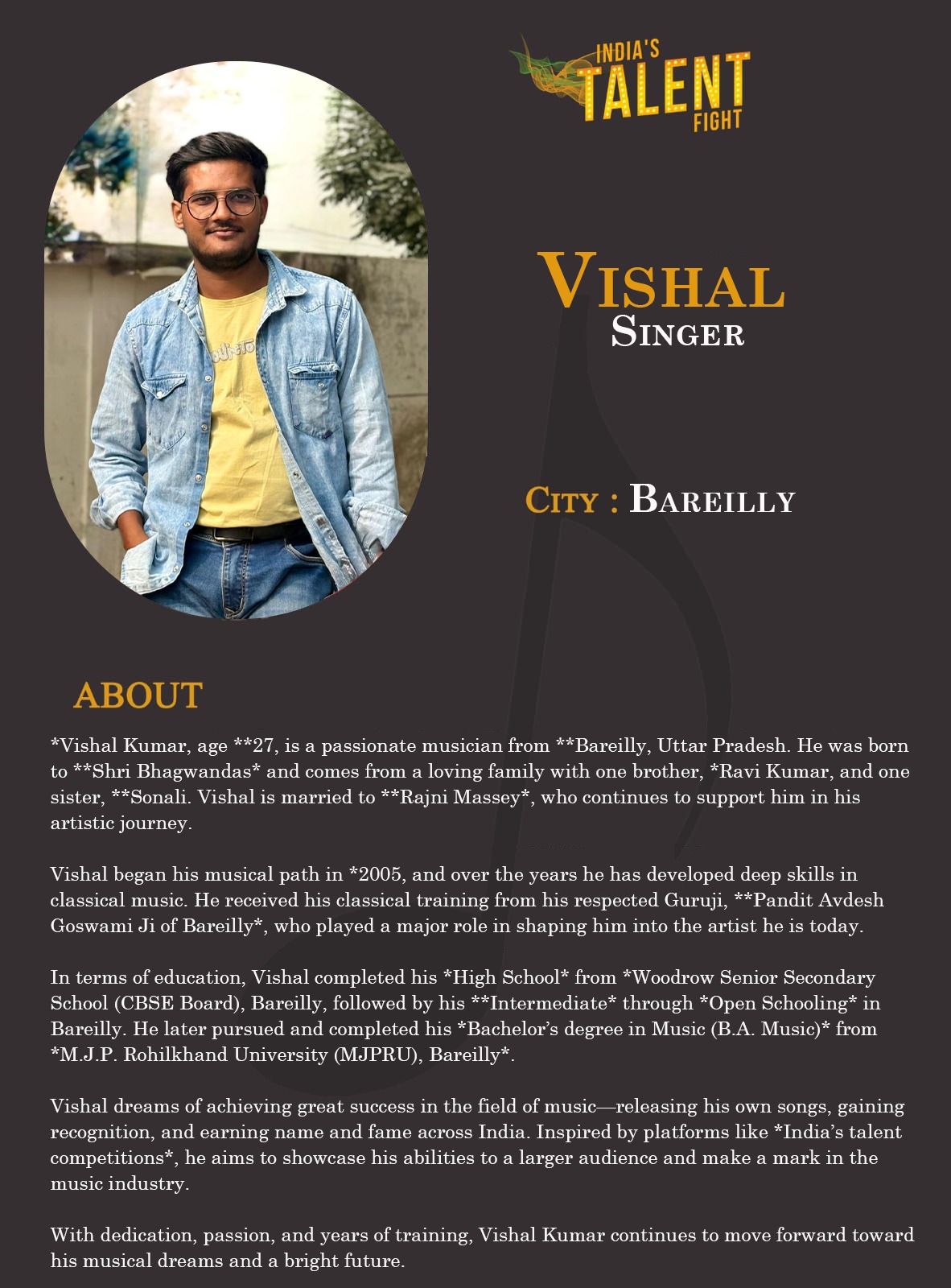 ITF Singer Vishal BareillyVishal Kumar, age **27, is a passionate musician from **Bareilly, Uttar Pradesh. He was born to *Shri Bhagwandas and comes from a loving family with one brother, *Ravi Kumar, and one sister, **Sonali. Vishal is married to *Rajni Massey, who continues to support him in his artistic journey.Vishal began his musical path in *2005, and over the years he has developed deep skills in classical music. He received his classical training from