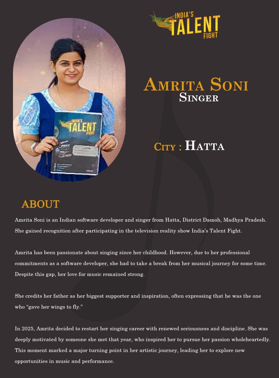 ITF Singer Amrita Soni Hatta Madhya PradeshAmrita Soni is an Indian software developer and singer from Hatta, District Damoh, Madhya Pradesh. She gained recognition after participating in the television reality show India’s Talent Fight.Amrita has been passionate about singing since her childhood. However, due to her professional commitments as a software developer, she had to take a break from her musical journey for some time. Despite this gap, her love for music remained strong.She credits
