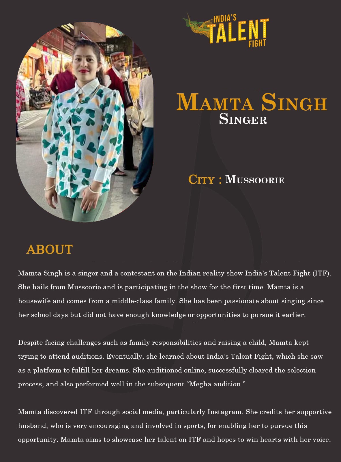 ITF Singer Mamta Singh mussoorieMamta Singh is a singer and a contestant on the Indian reality show India’s Talent Fight (ITF). She hails from Mussoorie and is participating in the show for the first time. Mamta is a housewife and comes from a middle-class family. She has been passionate about singing since her school days but did not have enough knowledge or opportunities to pursue it earlier.Despite facing challenges such as family responsibilities and raising