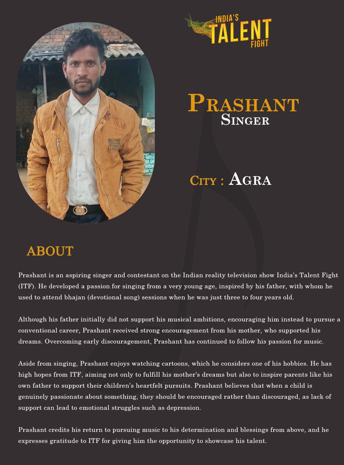 ITF Singer Prashant AgraPrashant is an aspiring singer and contestant on the Indian reality television show India’s Talent Fight (ITF). He developed a passion for singing from a very young age, inspired by his father, with whom he used to attend bhajan (devotional song) sessions when he was just three to four years old.Although his father initially did not support his musical ambitions, encouraging him instead to pursue a conventional career, Prashant received strong encouragement
