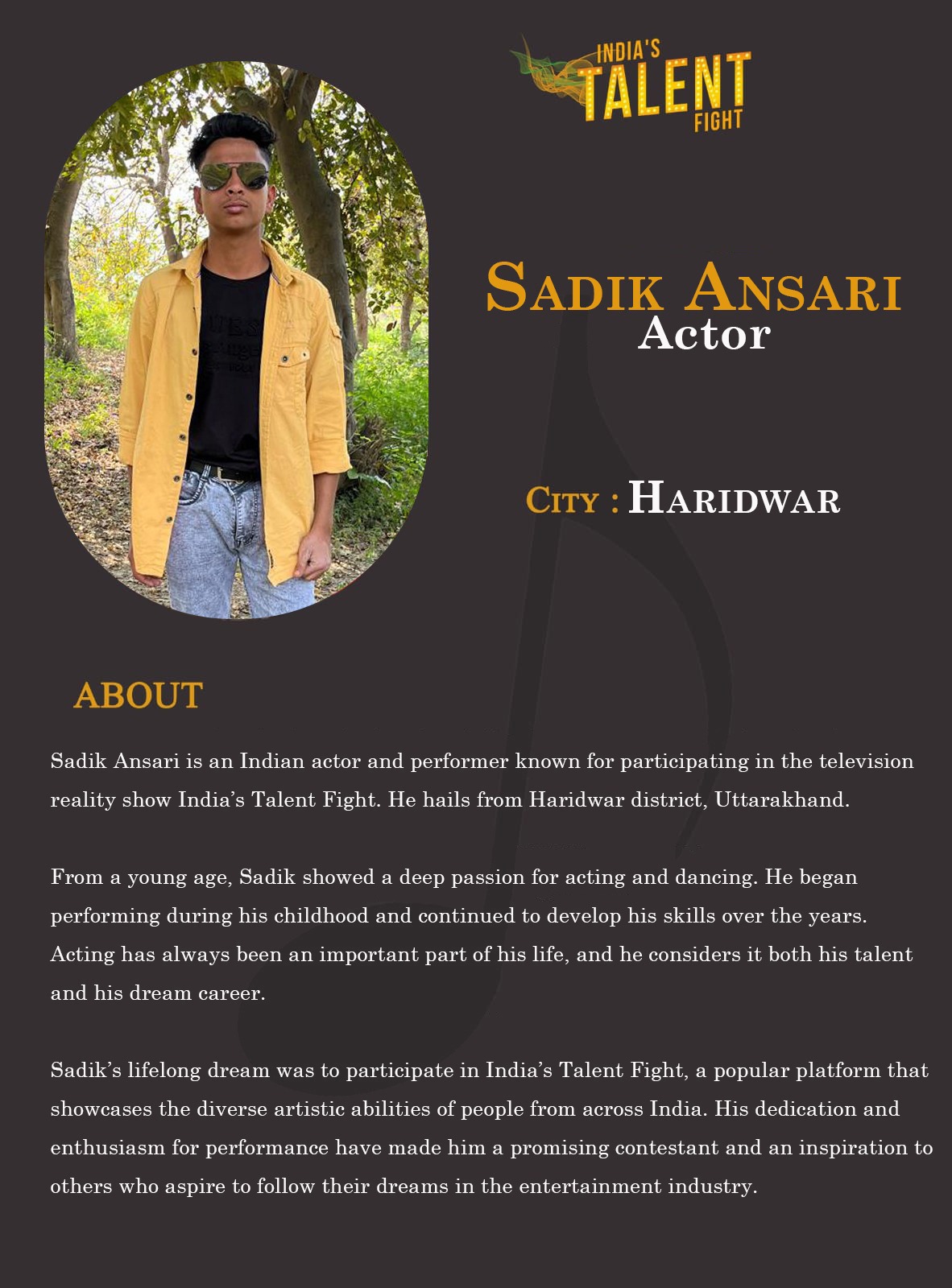 ITF Actor Sadik Ansari HaridwarSadik Ansari is an Indian actor and performer known for participating in the television reality show India’s Talent Fight. He hails from Haridwar district, Uttarakhand.From a young age, Sadik showed a deep passion for acting and dancing. He began performing during his childhood and continued to develop his skills over the years. Acting has always been an important part of his life, and he considers it both his talent and his
