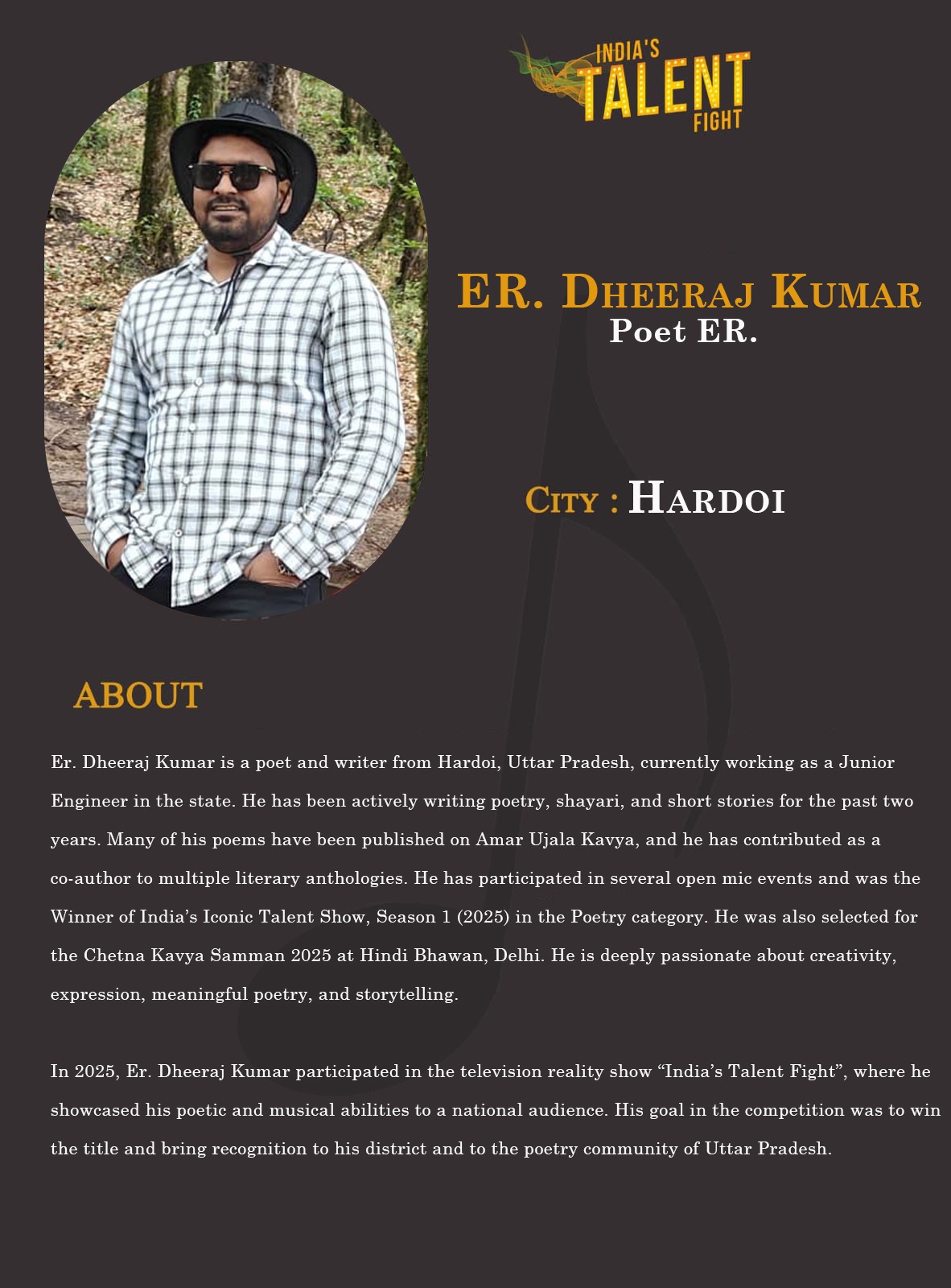 ITF Poet ER. Dheeraj Kumar HardoiEr. Dheeraj Kumar is a poet and writer from Hardoi, Uttar Pradesh, currently working as a Junior Engineer in the state. He has been actively writing poetry, shayari, and short stories for the past two years. Many of his poems have been published on Amar Ujala Kavya, and he has contributed as a co-author to multiple literary anthologies. He has participated in several open mic events and was the Winner
