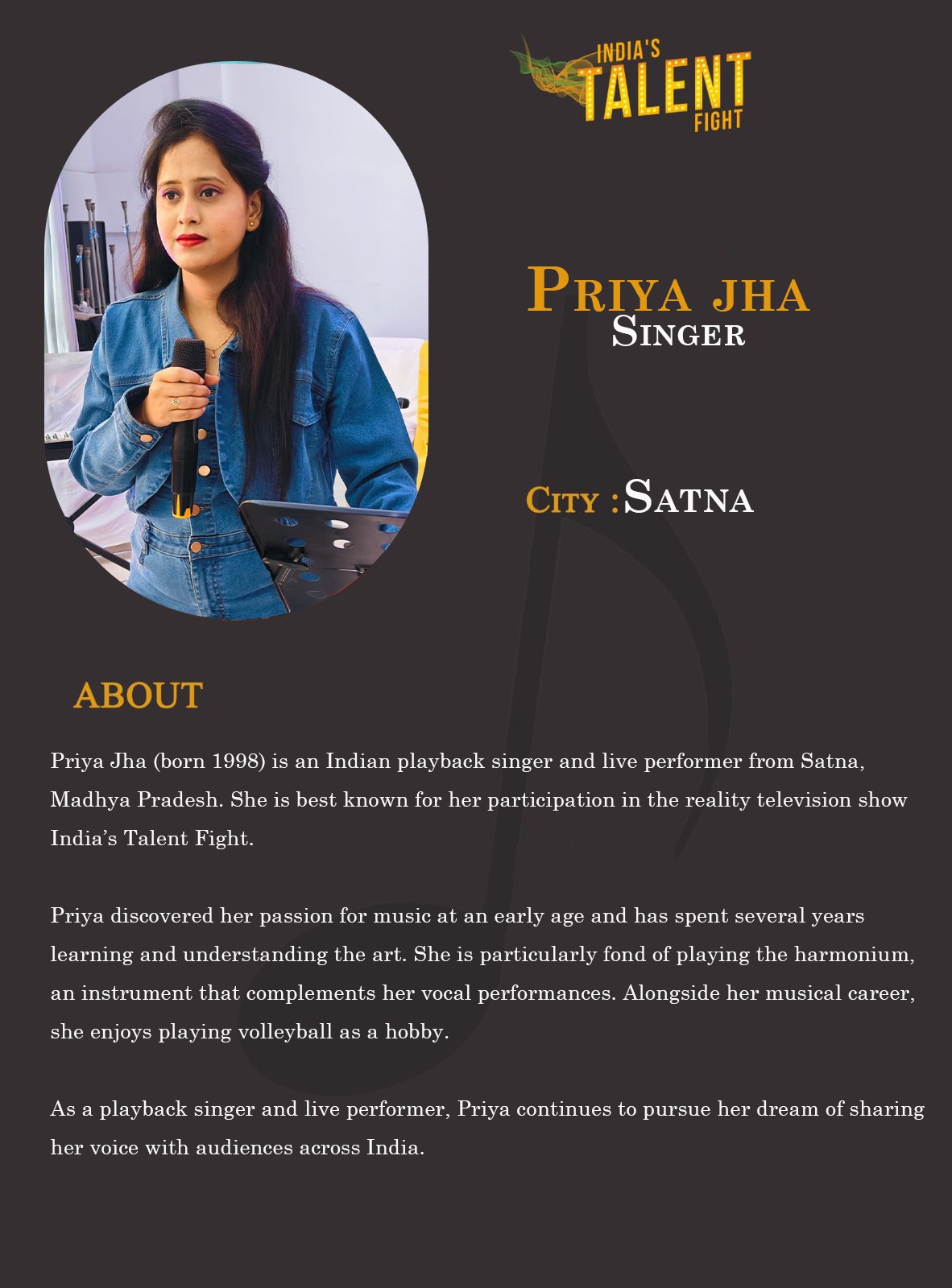 ITF Singer Priya jha Satnaperformer from Satna, Madhya Pradesh. She is best known for her participation in the reality television show India’s Talent Fight.Priya discovered her passion for music at an early age and has spent several years learning and understanding the art. She is particularly fond of playing the harmonium, an instrument that complements her vocal performances. Alongside her musical career, she enjoys playing volleyball as a hobby.As a playback singer and live performer,