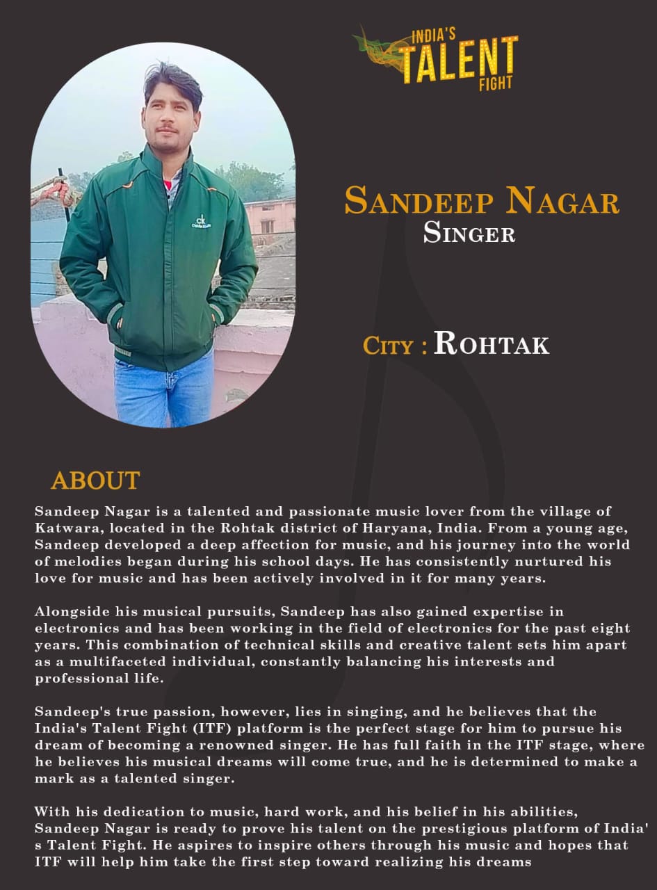 ITF Singer Sandeep Nagar RohtakSandeep Nagar is a talented and passionate music lover from the village of Katwara, located in the Rohtak district of Haryana, India. From a young age, Sandeep developed a deep affection for music, and his journey into the world of melodies began during his school days. He has consistently nurtured his love for music and has been actively involved in it for many years.Alongside his musical pursuits, Sandeep has also gained