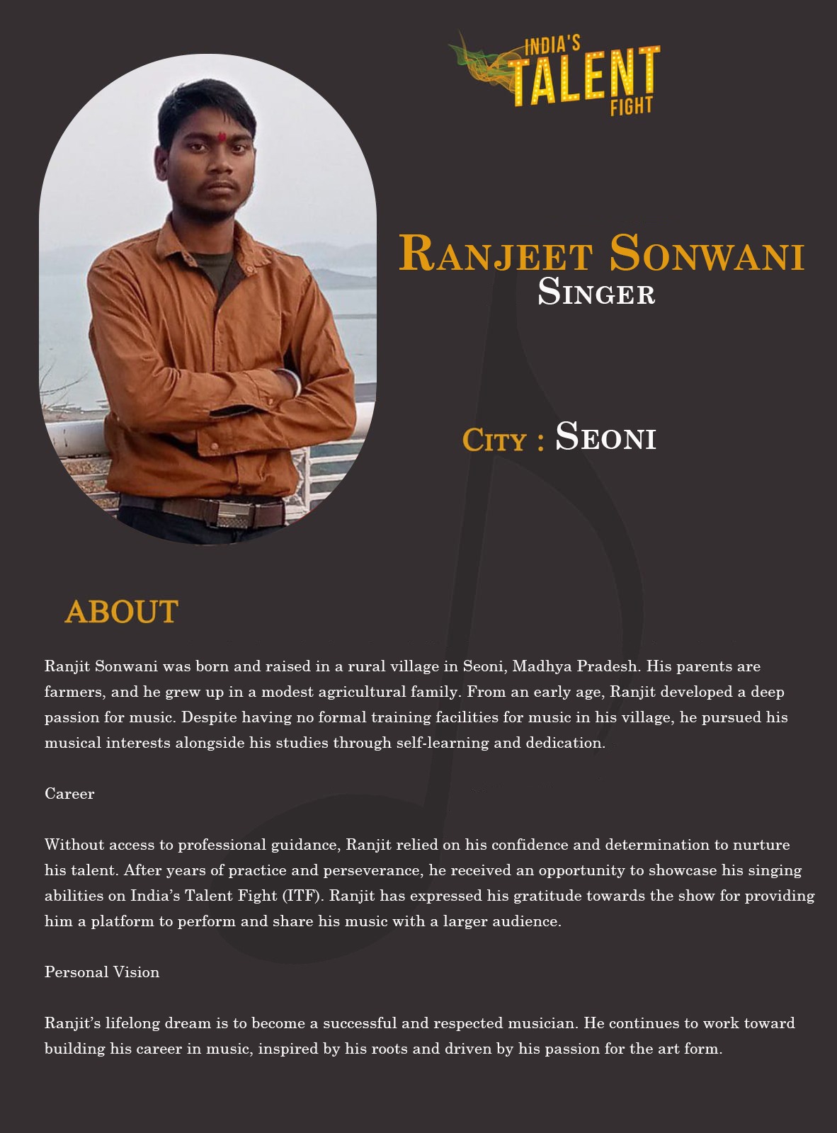 Singer Ranjeet Sonwani SeoniRanjit Sonwani was born and raised in a rural village in Seoni, Madhya Pradesh. His parents are farmers, and he grew up in a modest agricultural family. From an early age, Ranjit developed a deep passion for music. Despite having no formal training facilities for music in his village, he pursued his musical interests alongside his studies through self-learning and dedication.CareerWithout access to professional guidance, Ranjit relied on his confidence and determination