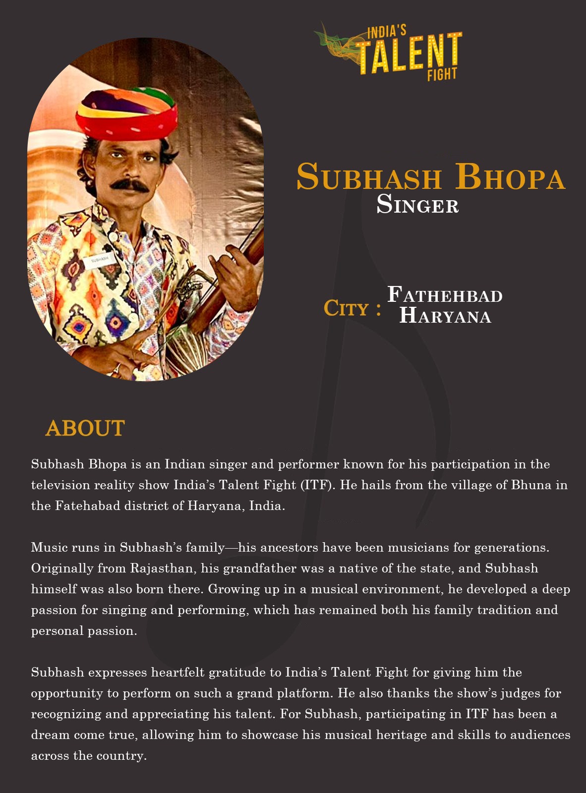 Singer Subhash Fathehbad HaryanaSubhash Bhopa is an Indian singer and performer known for his participation in the television reality show India’s Talent Fight (ITF). He hails from the village of Bhuna in the Fatehabad district of Haryana, India.Music runs in Subhash’s family—his ancestors have been musicians for generations. Originally from Rajasthan, his grandfather was a native of the state, and Subhash himself was also born there. Growing up in a musical environment, he developed a
