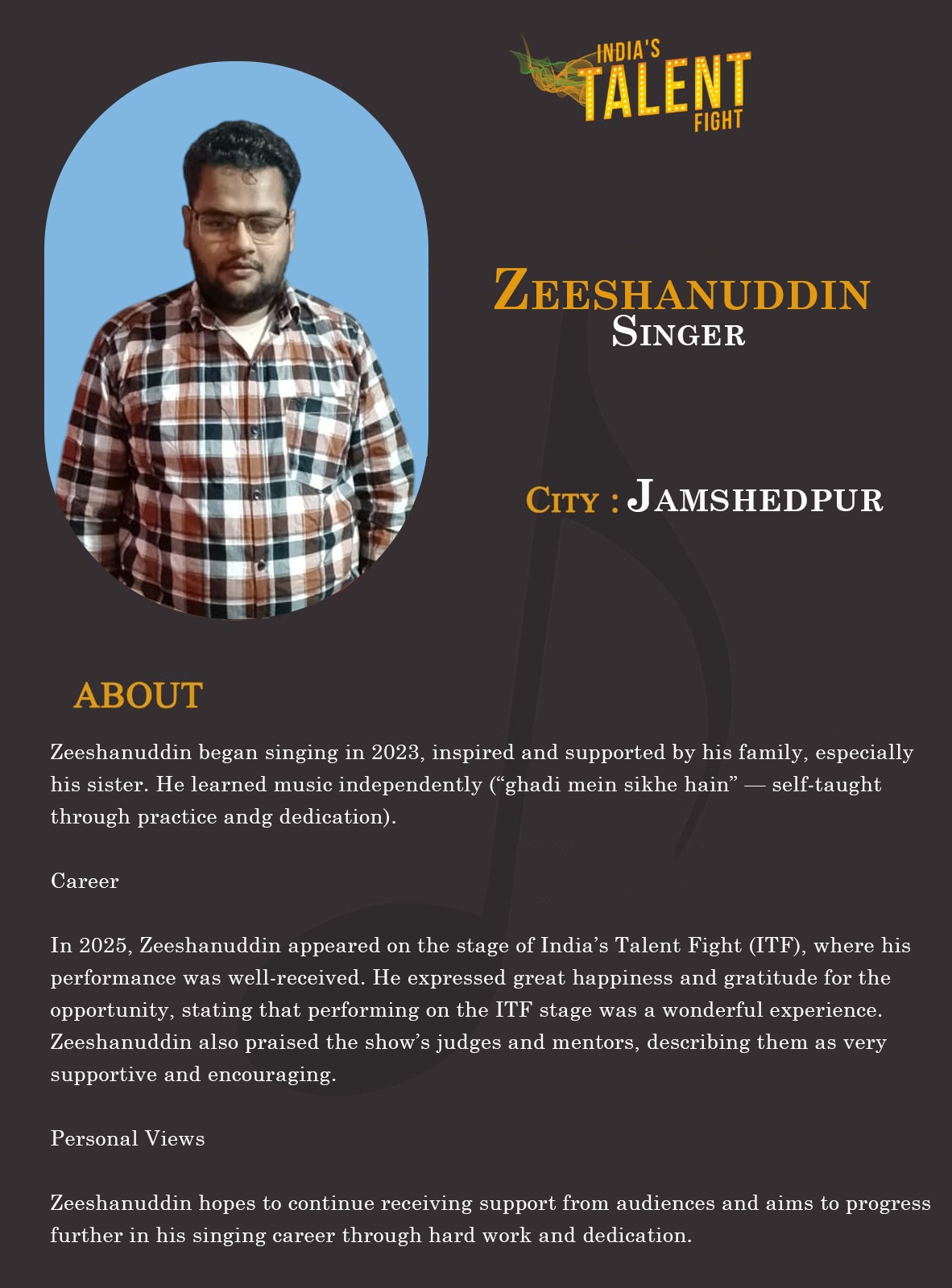 Singer Zeeshanuddin JamshedpurZeeshanuddin began singing in 2023, inspired and supported by his family, especially his sister. He learned music independently (“ghadi mein sikhe hain” — self-taught through practice andg dedication).CareerIn 2025, Zeeshanuddin appeared on the stage of India’s Talent Fight (ITF), where his performance was well-received. He expressed great happiness and gratitude for the opportunity, stating that performing on the ITF stage was a wonderful experience. Zeeshanuddin also praised the show’s judges and mentors, describing