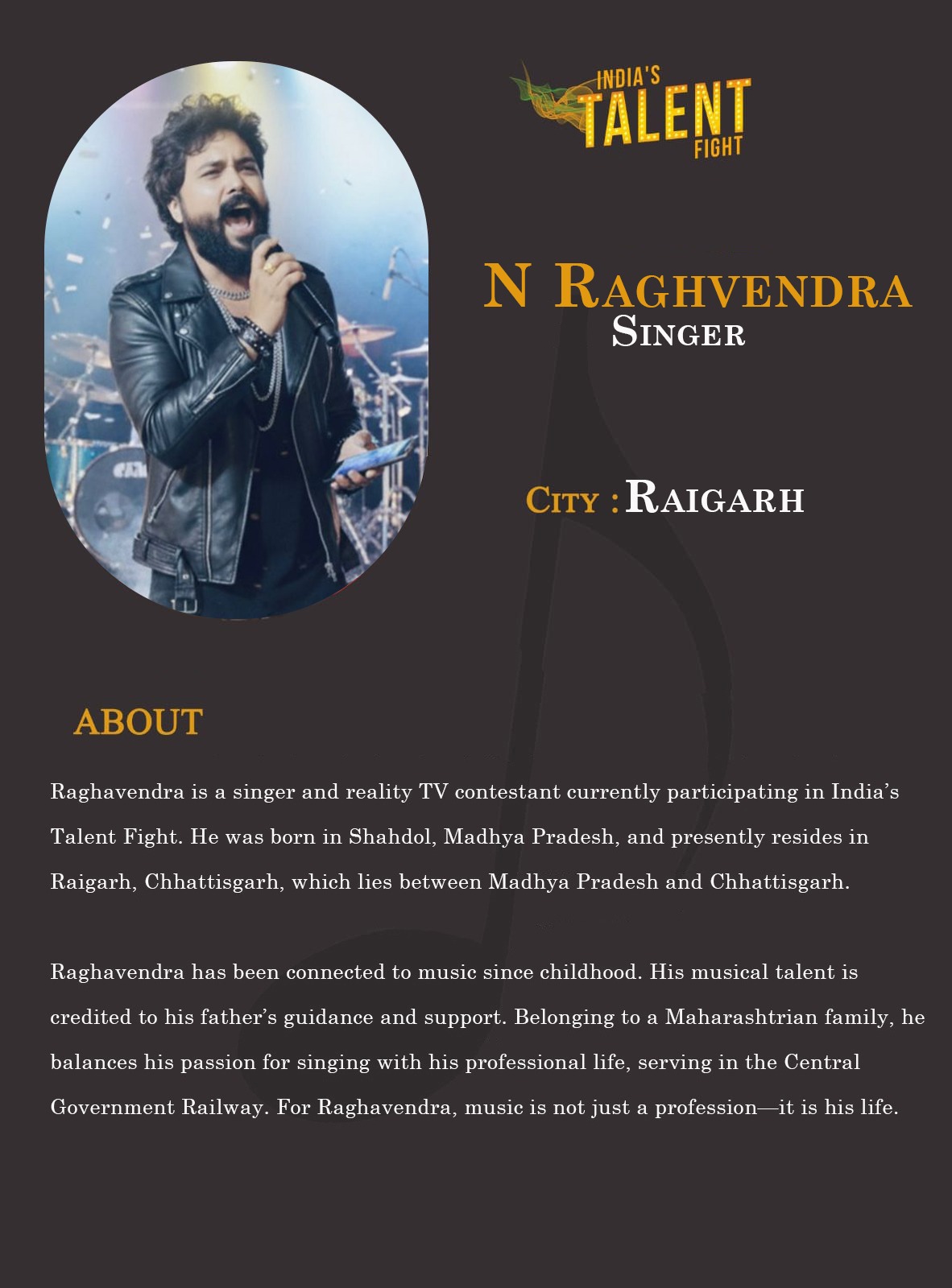 Singer N Raghvendra Raigarh ChhattisgarhRaghavendra is a singer and reality TV contestant currently participating in India’s Talent Fight. He was born in Shahdol, Madhya Pradesh, and presently resides in Raigarh, Chhattisgarh, which lies between Madhya Pradesh and Chhattisgarh.Raghavendra has been connected to music since childhood. His musical talent is credited to his father’s guidance and support. Belonging to a Maharashtrian family, he balances his passion for singing with his professional life, serving in the Central