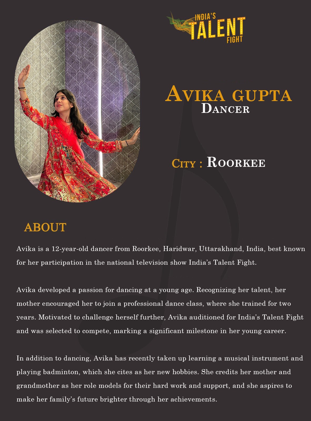 Dancer Avika gupta RoorkeeAvika is a 12-year-old dancer from Roorkee, Haridwar, Uttarakhand, India, best known for her participation in the national television show India’s Talent Fight.Avika developed a passion for dancing at a young age. Recognizing her talent, her mother encouraged her to join a professional dance class, where she trained for two years. Motivated to challenge herself further, Avika auditioned for India’s Talent Fight and was selected to compete, marking a significant milestone in