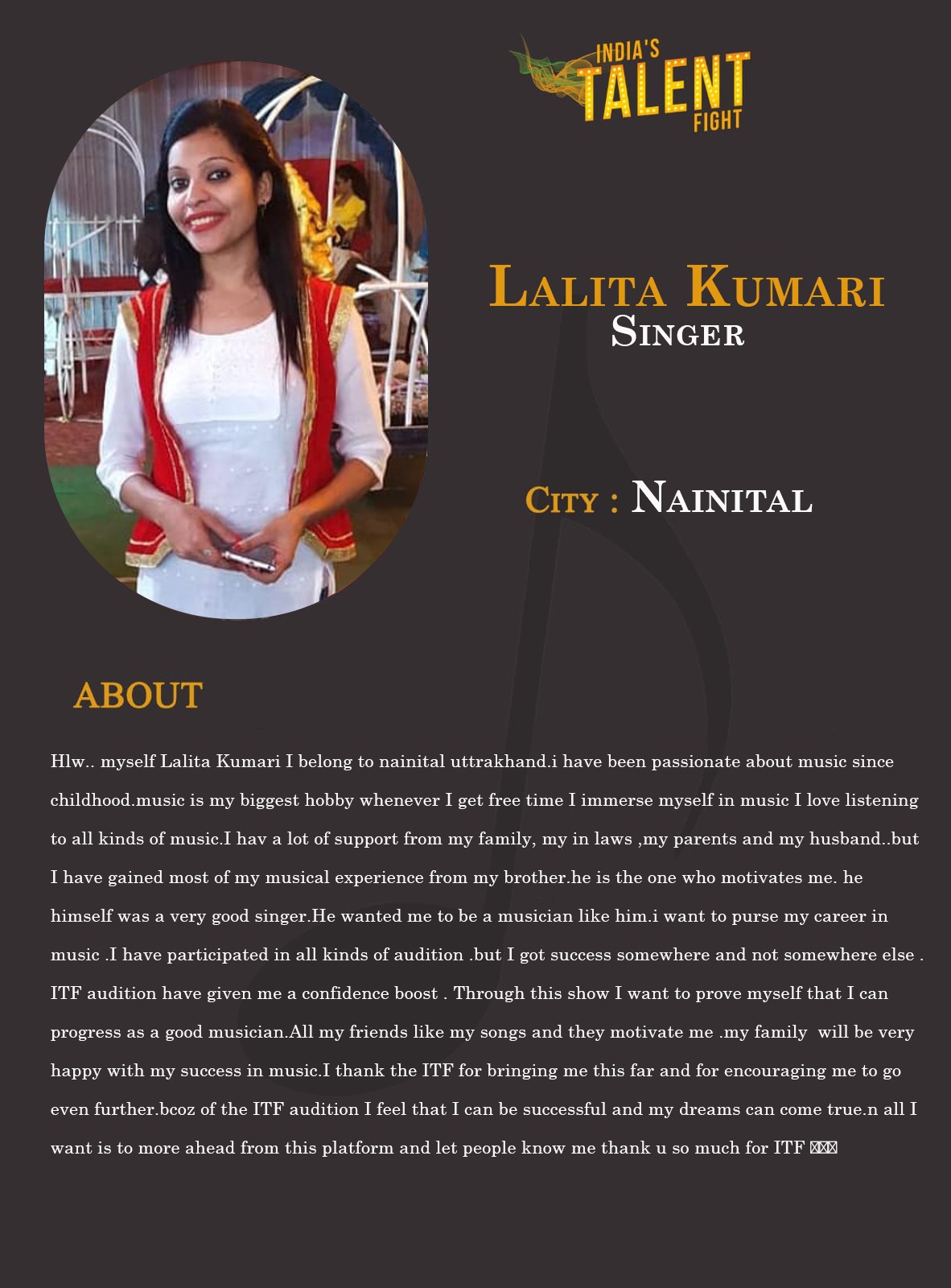 Singer Lalita Kumari NainitalHlw.. myself Lalita Kumari I belong to nainital uttrakhand.i have been passionate about music since childhood.music is my biggest hobby whenever I get free time I immerse myself in music I love listening to all kinds of music.I hav a lot of support from my family, my in laws ,my parents and my husband..but I have gained most of my musical experience from my brother.he is the one who motivates me. he