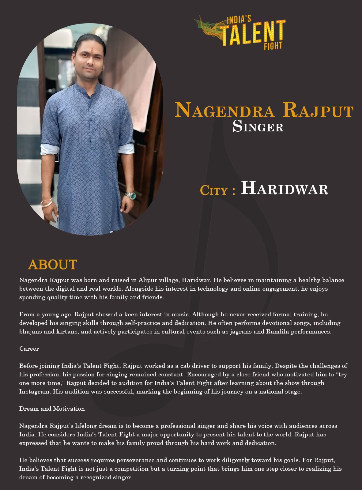 Singer Nagendra Rajput HaridwarNagendra Rajput was born and raised in Alipur village, Haridwar. He believes in maintaining a healthy balance between the digital and real worlds. Alongside his interest in technology and online engagement, he enjoys spending quality time with his family and friends.From a young age, Nagendra showed a keen interest in music. Although he never received formal training, he developed his singing skills through self-practice and dedication. He often performs devotional songs, including