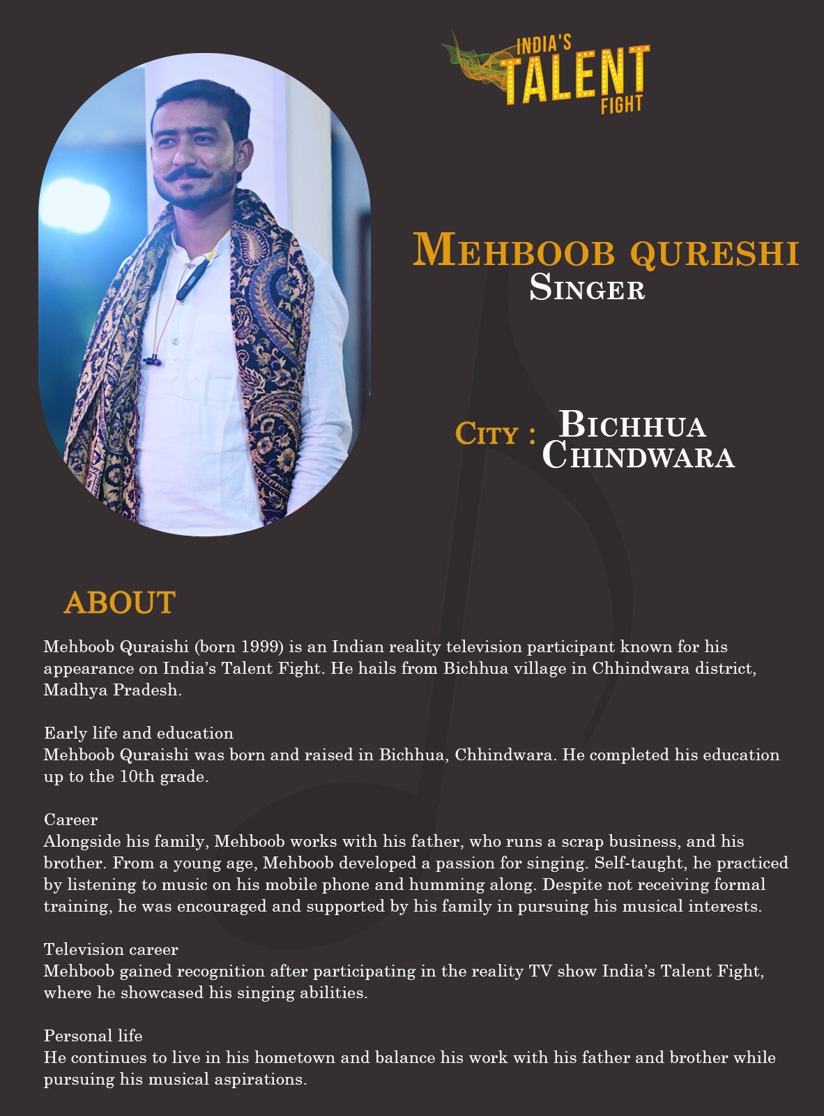 Singer Mehboob qureshi Bichhua ChindwaraMehboob Quraishi (born 1999) is an Indian reality television participant known for his appearance on India’s Talent Fight. He hails from Bichhua village in Chhindwara district, Madhya Pradesh.Early life and educationMehboob Quraishi was born and raised in Bichhua, Chhindwara. He completed his education up to the 10th grade.CareerAlongside his family, Mehboob works with his father, who runs a scrap business, and his brother. From a young age, Mehboob developed a passion