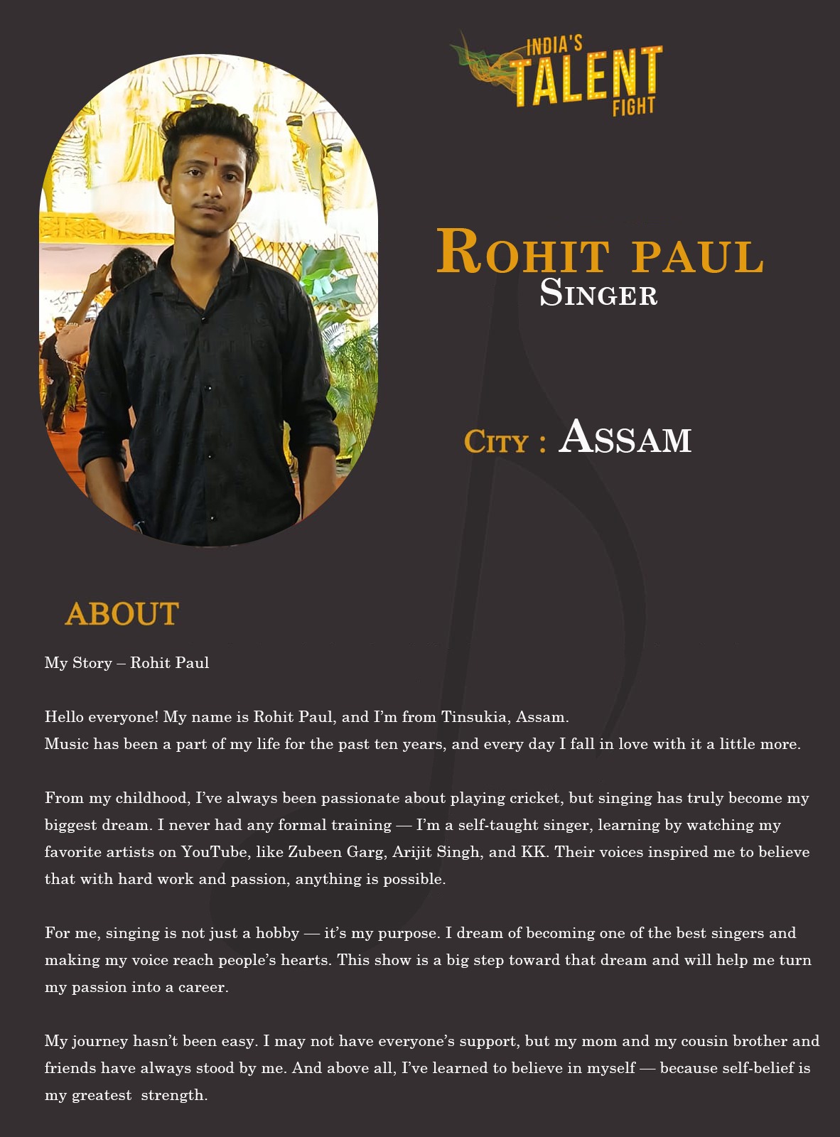 Singer Rohit paul AssamHello everyone! My name is Rohit Paul, and I’m from Tinsukia, Assam.Music has been a part of my life for the past ten years, and every day I fall in love with it a little more.From my childhood, I’ve always been passionate about playing cricket, but singing has truly become my biggest dream. I never had any formal training — I’m a self-taught singer, learning by watching my favorite artists on YouTube,
