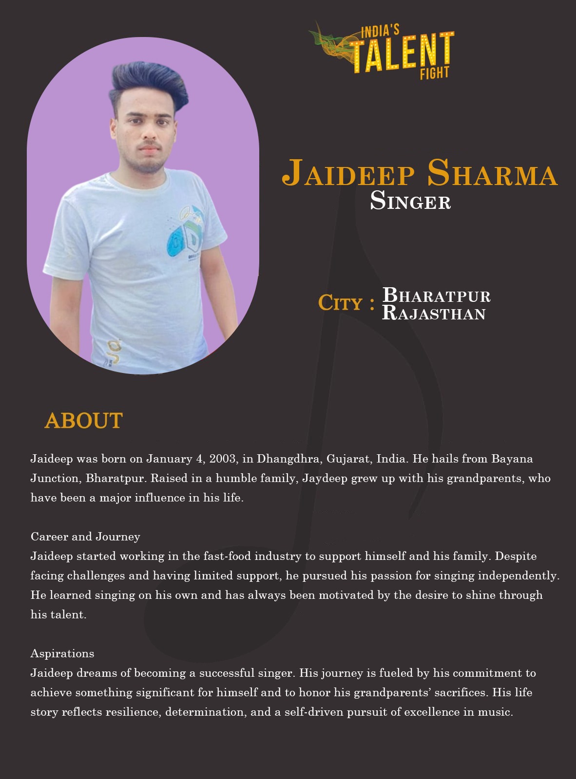 Singer Jaideep Sharma Bharatpur RajasthanJaideep was born on January 4, 2003, in Dhangdhra, Gujarat, India. He hails from Bayana Junction, Bharatpur. Raised in a humble family, Jaydeep grew up with his grandparents, who have been a major influence in his life.Career and JourneyJaideep started working in the fast-food industry to support himself and his family. Despite facing challenges and having limited support, he pursued his passion for singing independently. He learned singing on his own