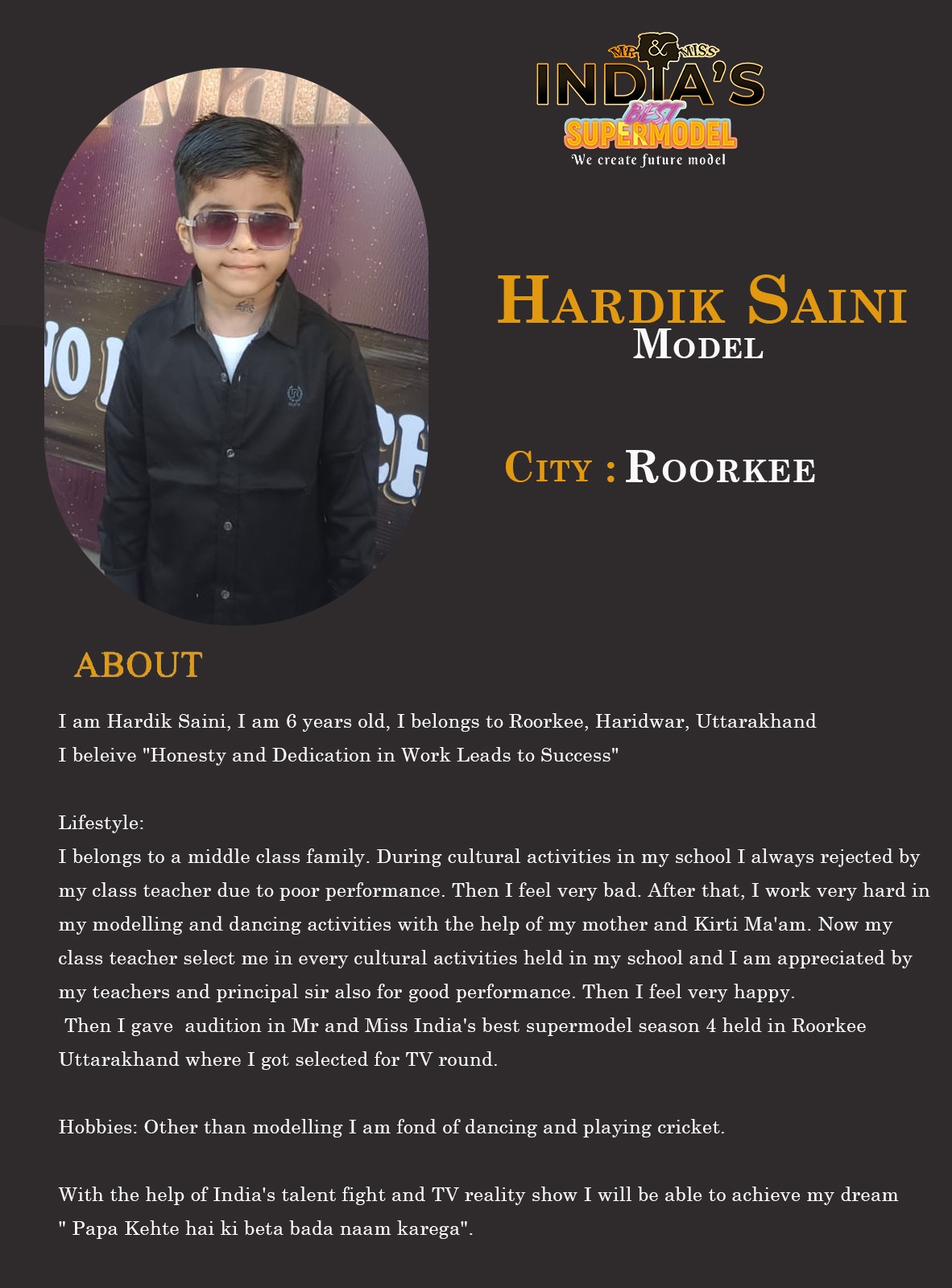 ITF Model Hardik Saini RoorkeeI am Hardik Saini, I am 6 years old, I belongs to Roorkee, Haridwar, UttarakhandI beleive “Honesty and Dedication in Work Leads to Success”Lifestyle:I belongs to a middle class family. During cultural activities in my school I always rejected by my class teacher due to poor performance. Then I feel very bad. After that, I work very hard in my modelling and dancing activities with the help of my mother and