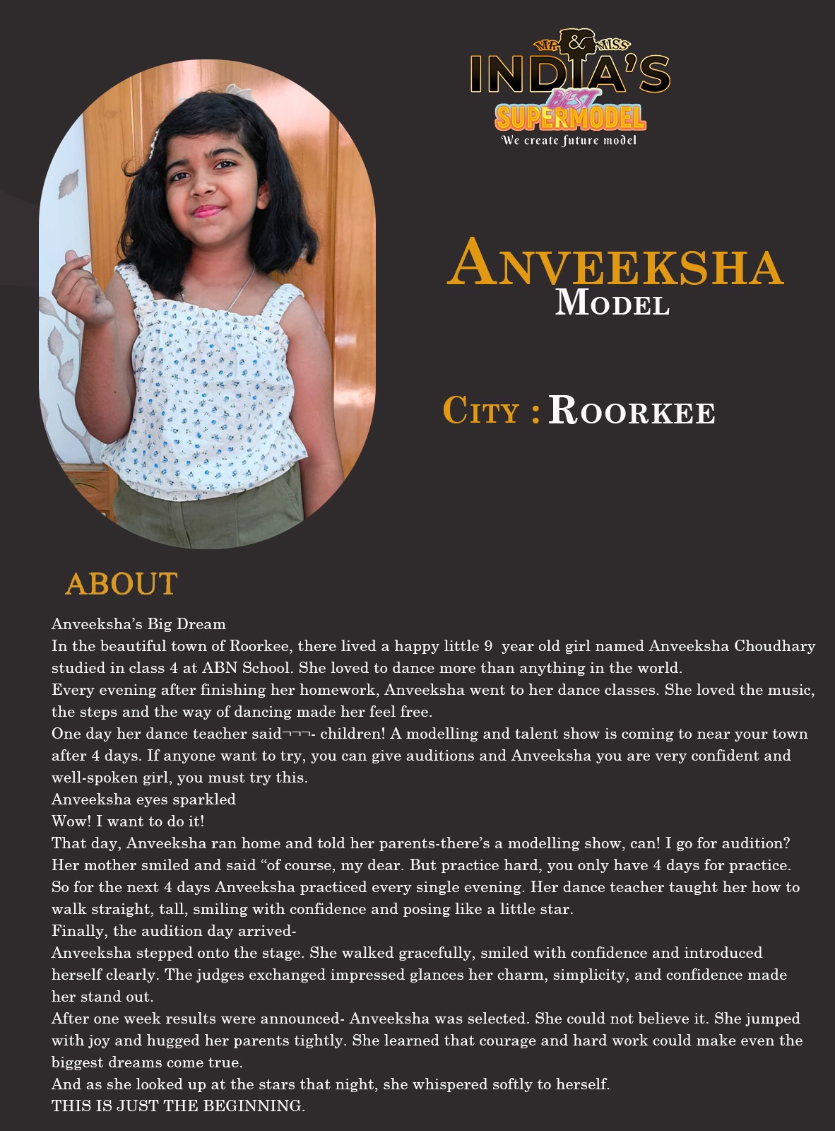 ITF Model Anveeksha RoorkeeAnveeksha’s Big DreamIn the beautiful town of Roorkee, there lived a happy little 9 year old girl named Anveeksha Choudhary studied in class 4 at ABN School. She loved to dance more than anything in the world.Every evening after finishing her homework, Anveeksha went to her dance classes. She loved the music, the steps and the way of dancing made her feel free.One day her dance teacher said children! A modelling and