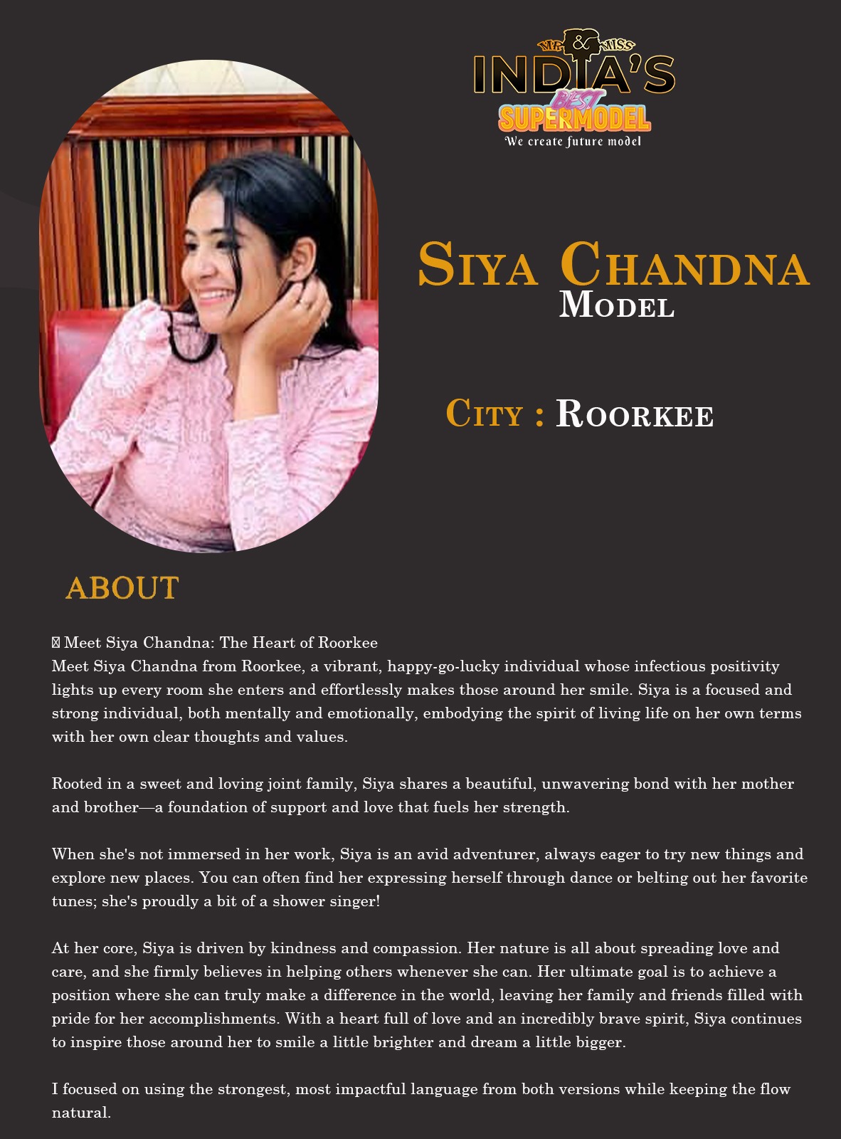 ITF Model Siya Chandna RoorkeeMeet Siya Chandna: The Heart of RoorkeeMeet Siya Chandna from Roorkee, a vibrant, happy-go-lucky individual whose infectious positivity lights up every room she enters and effortlessly makes those around her smile. Siya is a focused and strong individual, both mentally and emotionally, embodying the spirit of living life on her own terms with her own clear thoughts and values.Rooted in a sweet and loving joint family, Siya shares a beautiful, unwavering