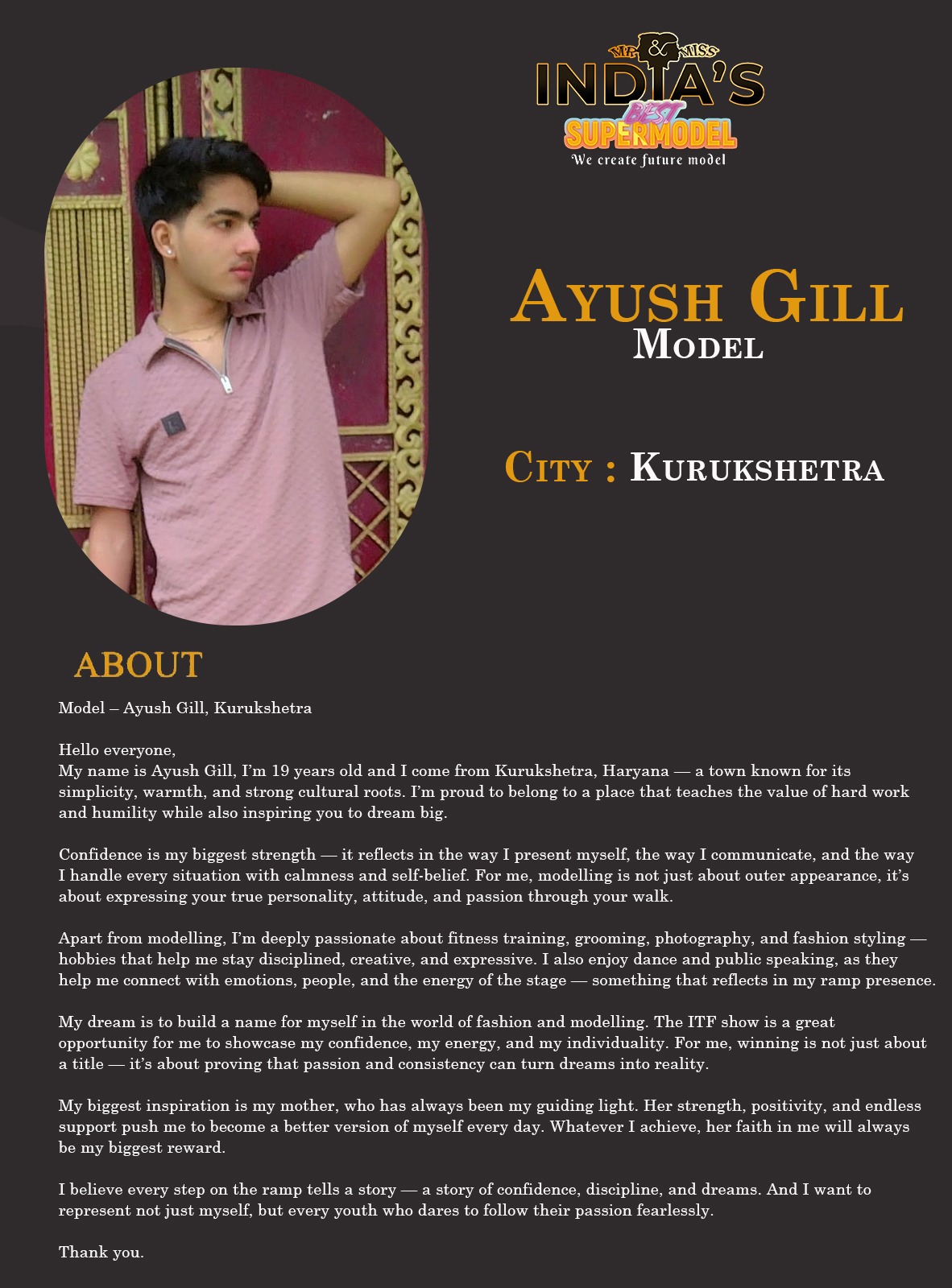 ITF Model Ayush Gill KurukshetraHello everyone,My name is Ayush Gill, I’m 19 years old and I come from Kurukshetra, Haryana — a town known for its simplicity, warmth, and strong cultural roots. I’m proud to belong to a place that teaches the value of hard work and humility while also inspiring you to dream big.Confidence is my biggest strength — it reflects in the way I present myself, the way I communicate, and the way