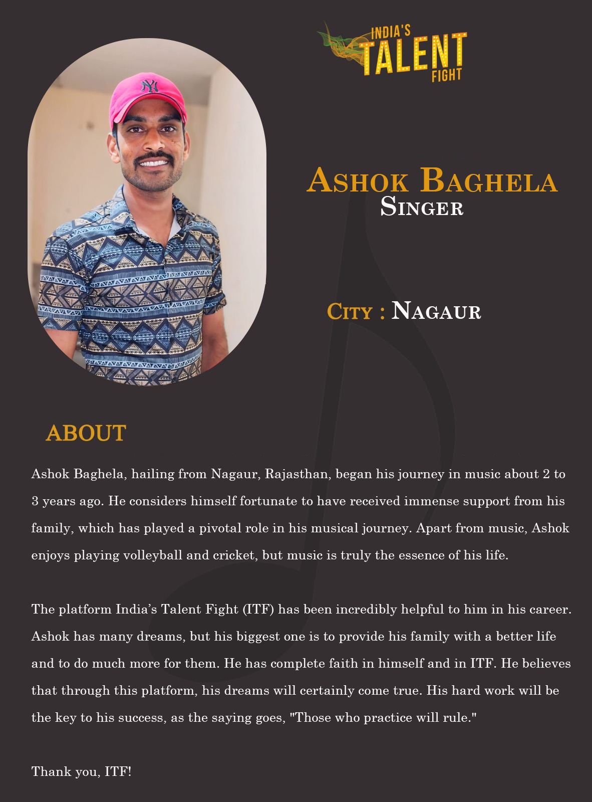 ITF Singer Ashok Baghela NagaurAshok Baghela, hailing from Nagaur, Rajasthan, began his journey in music about 2 to 3 years ago. He considers himself fortunate to have received immense support from his family, which has played a pivotal role in his musical journey. Apart from music, Ashok enjoys playing volleyball and cricket, but music is truly the essence of his life.The platform India’s Talent Fight (ITF) has been incredibly helpful to him in his career.