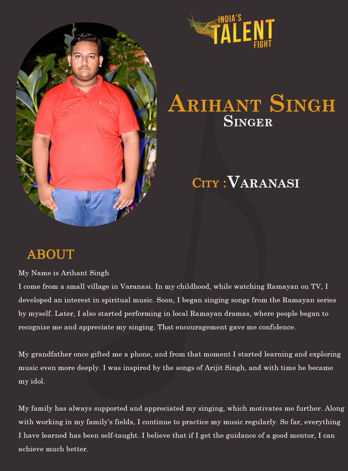 ITF Singer Arihant Singh VaranasiMy Name is Arihant SinghI come from a small village in Varanasi. In my childhood, while watching Ramayan on TV, I developed an interest in spiritual music. Soon, I began singing songs from the Ramayan series by myself. Later, I also started performing in local Ramayan dramas, where people began to recognize me and appreciate my singing. That encouragement gave me confidence.My grandfather once gifted me a phone, and from that