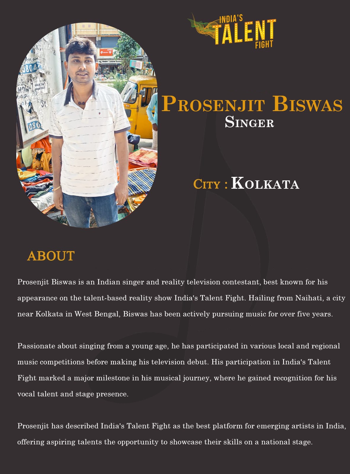 ITF Singer Prosenjit Biswas Naihati kolkataMy Name is Arihant SinghI come from a small village in Varanasi. In my childhood, while watching Ramayan on TV, I developed an interest in spiritual music. Soon, I began singing songs from the Ramayan series by myself. Later, I also started performing in local Ramayan dramas, where people began to recognize me and appreciate my singing. That encouragement gave me confidence.My grandfather once gifted me a phone, and from