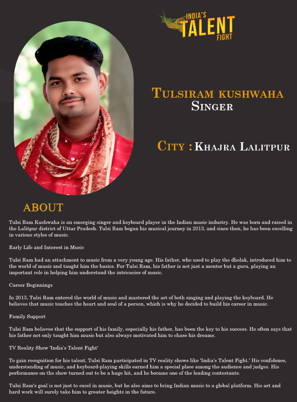 ITF Singer Tulsiram kushwaha Khajra LalitpurTulsi Ram Kushwaha is an emerging singer and keyboard player in the Indian music industry. He was born and raised in the Lalitpur district of Uttar Pradesh. Tulsi Ram began his musical journey in 2013, and since then, he has been excelling in various styles of music.Early Life and Interest in MusicTulsi Ram had an attachment to music from a very young age. His father, who used to play the