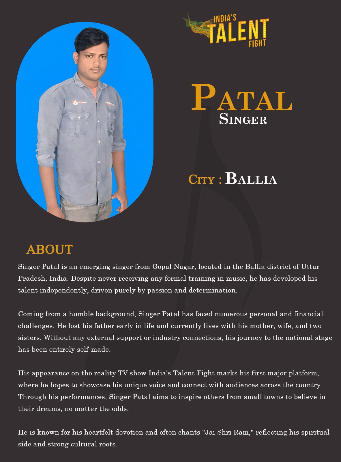 ITF Singer Patal Gopal Nagar BalliaSinger Patal is an emerging singer from Gopal Nagar, located in the Ballia district of Uttar Pradesh, India. Despite never receiving any formal training in music, he has developed his talent independently, driven purely by passion and determination.Coming from a humble background, Singer Patal has faced numerous personal and financial challenges. He lost his father early in life and currently lives with his mother, wife, and two sisters. Without any
