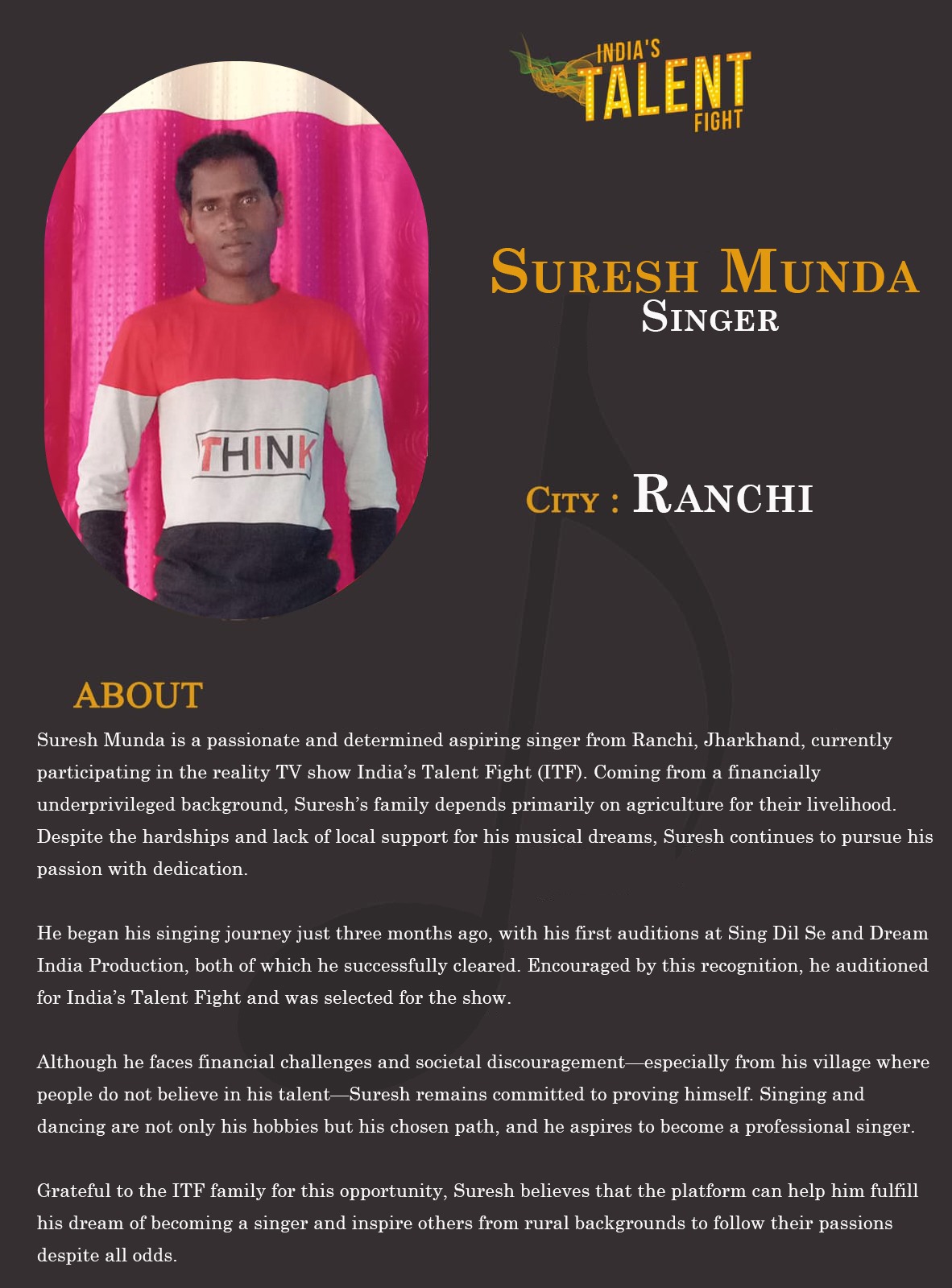 ITF Singer Suresh Munda RanchiSuresh Munda is a passionate and determined aspiring singer from Ranchi, Jharkhand, currently participating in the reality TV show India’s Talent Fight (ITF). Coming from a financially underprivileged background, Suresh’s family depends primarily on agriculture for their livelihood. Despite the hardships and lack of local support for his musical dreams, Suresh continues to pursue his passion with dedication.He began his singing journey just three months ago, with his first auditions at