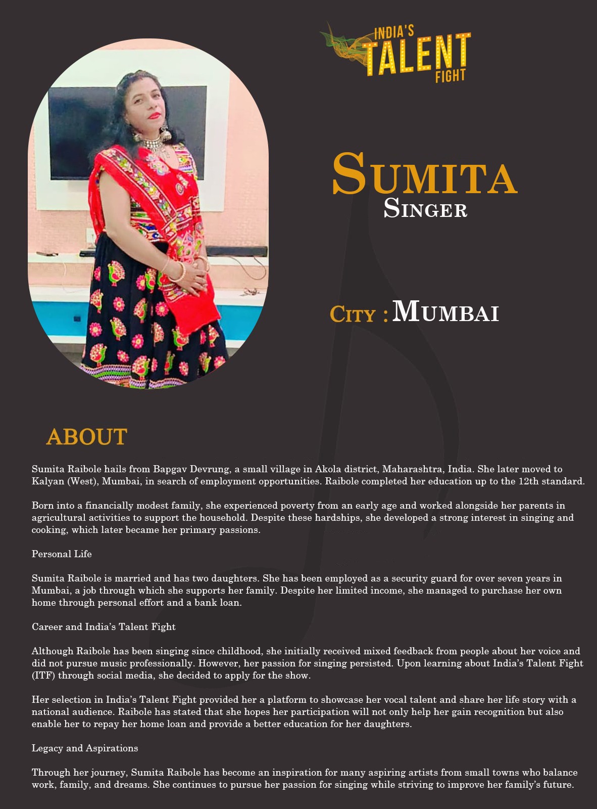 ITF Singer Sumita MumbaiSumita Raibole hails from Bapgav Devrung, a small village in Akola district, Maharashtra, India. She later moved to Kalyan (West), Mumbai, in search of employment opportunities. Raibole completed her education up to the 12th standard.Born into a financially modest family, she experienced poverty from an early age and worked alongside her parents in agricultural activities to support the household. Despite these hardships, she developed a strong interest in singing and cooking, which