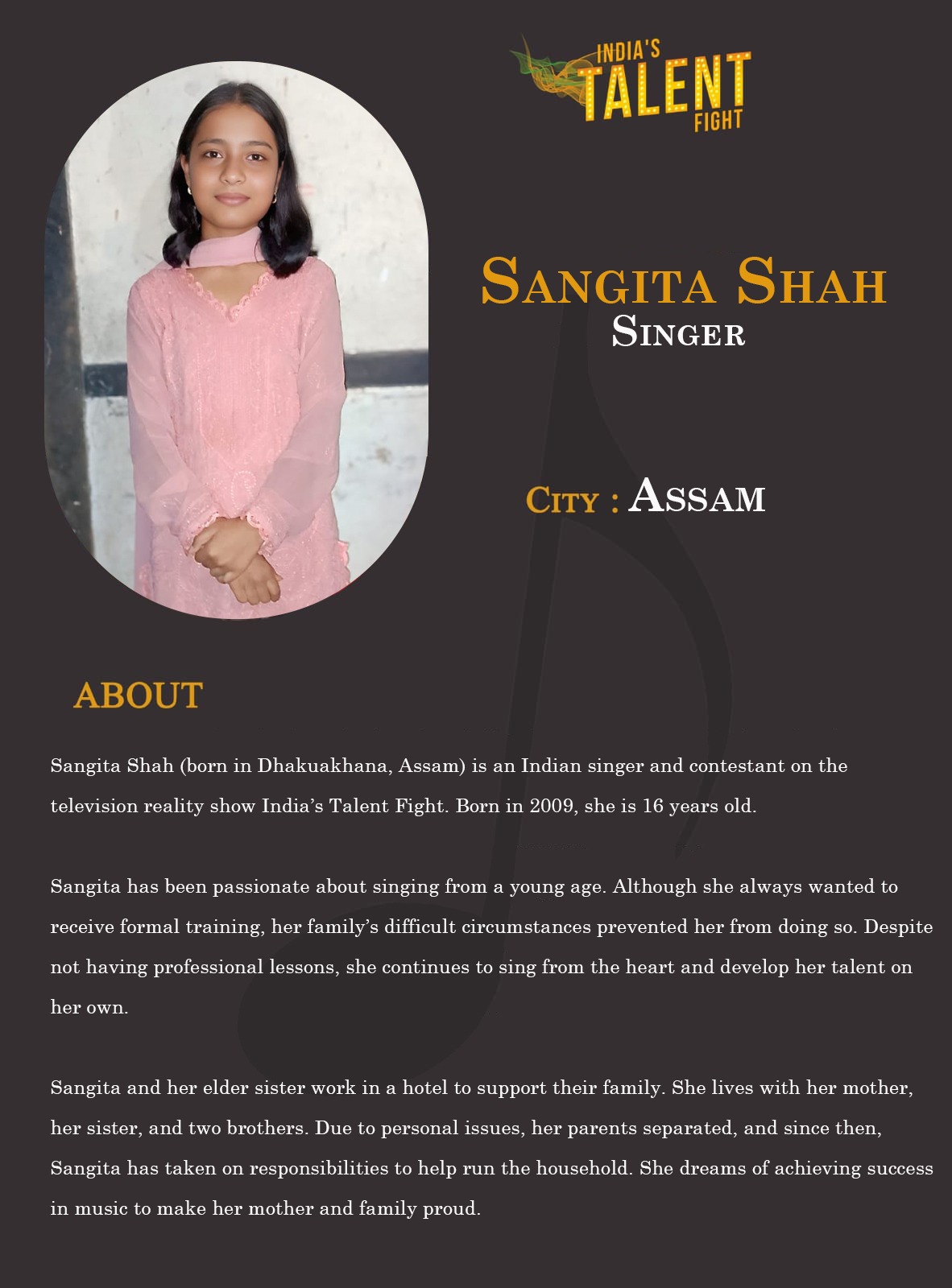 ITF Singer Sangita Shah AssamSangita Shah (born in Dhakuakhana, Assam) is an Indian singer and contestant on the television reality show India’s Talent Fight. Born in 2009, she is 16 years old.Sangita has been passionate about singing from a young age. Although she always wanted to receive formal training, her family’s difficult circumstances prevented her from doing so. Despite not having professional lessons, she continues to sing from the heart and develop her talent on